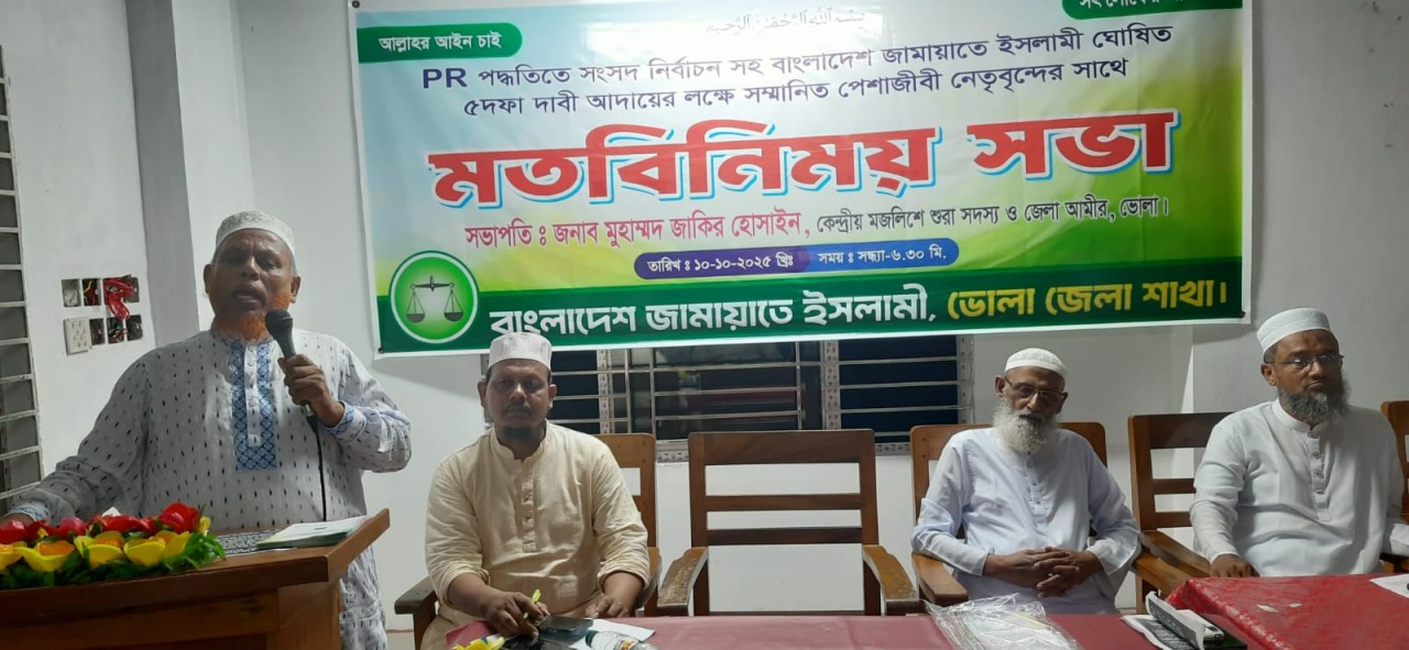 সভায় সভাপতিত্ব করেন বাংলাদেশ জামায়াতে ইসলামী ভোলা জেলা আমির ও কেন্দ্রীয় মজলিসে শুরার সদস্য মুহাম্মদ জাকির হোসাইন। উপস্থিত ছিলেন জেলা সেক্রেটারি মাওলানা হারুনুর রশিদ, জেলা সহকারী সেক্রেটারি মাওলানা আব্বাস উদ্দিন, কর্মপরিষদ সদস্য জিয়াউল মোর্শেদ চৌধুরী, মাওলানা জাকির হোসাইন এবং পৌর আমির জামাল উদ্দিনসহ দলের অন্যান্য নেতৃবৃন্দ। সভায় বক্তারা বলেন, বাংলাদেশে সুষ্ঠু নির্বাচন ও গণতান্ত্রিক অধিকার প্রতিষ্ঠার জন্য PR পদ্ধতির নির্বাচন ব্যবস্থা বাস্তবায়ন জরুরি।