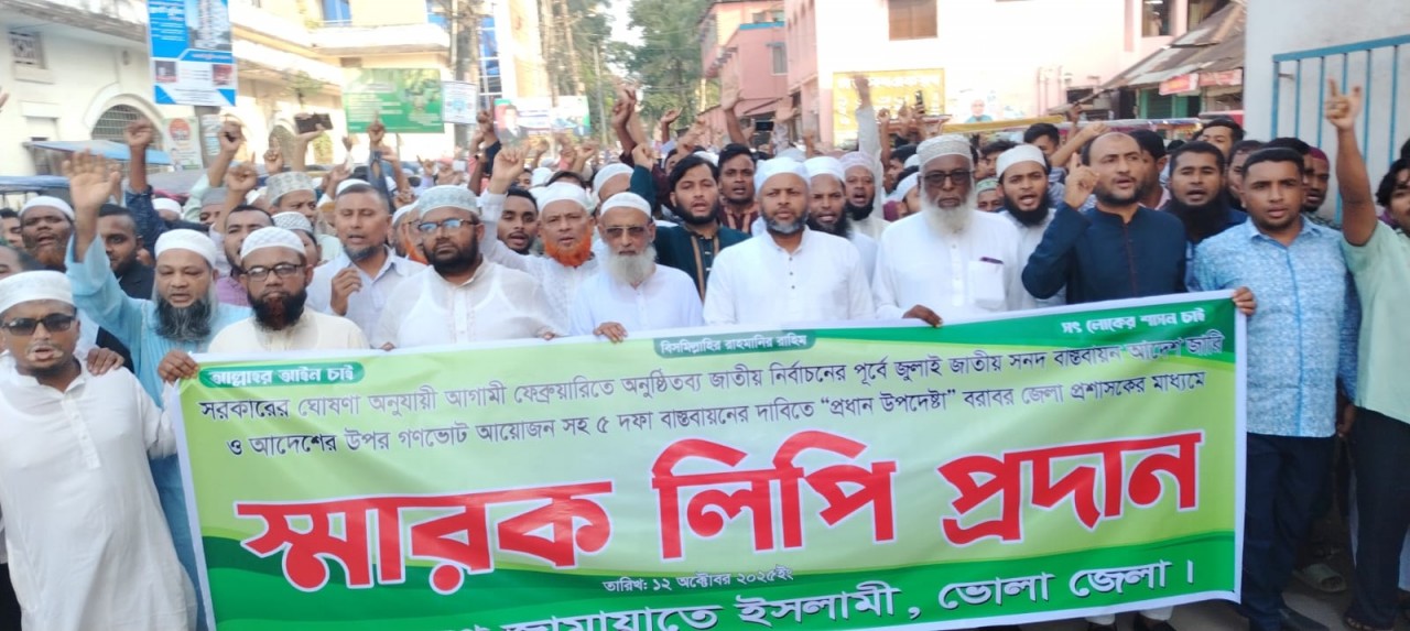 রবিবার ১২ অক্টোবর রবিবার কেন্দ্র ঘোষিত কর্মসূচির অংশ হিসেবে ৫ দাবী সম্বলিত স্মারকলিপি ভোলা জেলা প্রশাসক মোঃ আজাদ জাহান এর মাধ্যমে প্রধান উপদেষ্টা বরাবর প্রদান করা হয়। স্মারকলিপি প্রদানের সময় উপস্থিত ছিলেন, জামায়াতে ইসলামীর জেলা আমির মাস্টার জাকির হোসাইন, জেলা সেক্রেটারি মাওলানা হারুনুর রশিদ, ভোলা-১ আসনের জামায়াত মনোনীত সংসদ সদস্য প্রার্থী অধ্যক্ষ নজরুল ইসলাম, ভোলা-২ আসনের প্রার্থী মাওলানা ফজলুল করিম, ভোলা-৩ আসনের জামায়াত সমর্থিত প্রার্থী নিজামুল হক নাঈম, ভোলা-৪ আসনের জামায়াত মনোনীত প্রার্থী অধ্যক্ষ মোস্তফা কামাল, জেলা সহকারি সেক্রেটারি মাওলানা আব্বাস উদ্দিন, মাওলানা আক্তার উল্লাহ, মাওলানা ইসমাইল হোসেন মনির, ভোলা সদর আমীর মাওলানা কামাল হোসেন, ভোলা পৌর আমির জামাল উদ্দিন, ছাত্র শিবিরের ভোলা শহর সভাপতি আব্দুল্লাহ আল আমিনসহ জেলা ও উপজেলা নেতৃবৃন্দ।