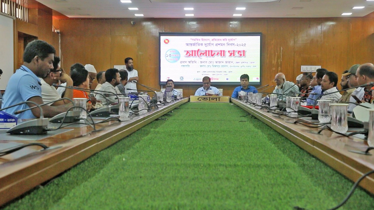 আলোচনা সভায় বক্তারা বলেন, জলবায়ু পরিবর্তনের প্রভাবে উপকূলীয় জেলা ভোলা প্রতিনিয়ত ঘূর্ণিঝড়, জলোচ্ছ্বাস, বন্যা ও নদীভাঙনসহ নানা প্রাকৃতিক দুর্যোগের ঝুঁকিতে রয়েছে। তাই সরকার ও বেসরকারি সংস্থাগুলোর সমন্বিত প্রচেষ্টায় দুর্যোগ ব্যবস্থাপনা ও প্রতিরোধমূলক উদ্যোগ আরও জোরদার করতে হবে। সভায় উপস্থিত ছিলেন দুর্যোগ ব্যবস্থাপনা অধিদপ্তর, ফায়ার সার্ভিস, জেলা যুব রেড ক্রিসেন্ট, গ্রামীণ জন উন্নয়ন সংস্থা (জিজেইউএস), ব্র্যাক, আভাস, সুশীলন, পিসিসি, কোস্ট ফাউন্ডেশনসহ বিভিন্ন সরকারি-বেসরকারি প্রতিষ্ঠানের প্রতিনিধি ও স্থানীয় জনপ্রতিনিধিরা।