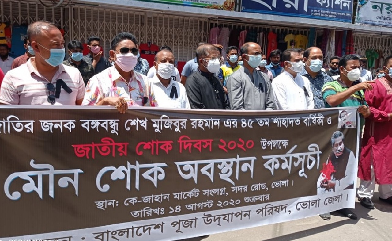অচিন্ত্য মজুমদার: ১৫ আগস্ট স্বাধীনতার মহান স্থপতি জাতির জনক বঙ্গবন্ধু শেখ মুজিবুর রহমানের ৪৫তম শাহাদত বার্ষিকী ও জাতীয় শোক দিবস উপলক্ষে ভোলায় মৌন শোক অবস্থান কর্মসূচী পালন করেছে জেলা পূজা উদযাপন পরিষদ। আজ শুক্রবার সকালে স্বাস্থ্য সুরক্ষাবিধি মেনে শহরের কেজাহান মার্কেট চত্তরে এ কর্মসূচীতে পূজা উদযাপন পরিষদের সদস্য ও নেতৃবৃন্দসহ বিভিন্ন স্তরের মানুষ যোগ দেন।