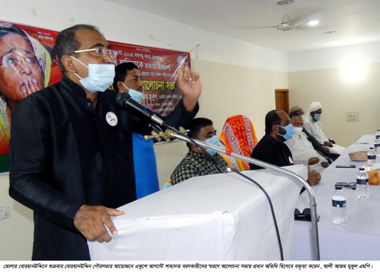 সরোয়ার শিমুল,বোরহানউদ্দিন : প্রাথমিক ও গণশিক্ষা মন্ত্রনালয় সম্পর্কিত সংসদীয় স্থায়ী কমিটির সদস্য ভোলা-২(বোরহানউদ্দিন-দৌলতখান)আসনের সংসদ সদস্য (এমপি)আলী আজম মুকুল বলেছেন, ১৫ ও ২১ আগস্টের কুশীলবরা একই সূতোয় গাঁথা। কুশীলবদের উদ্দেশ্য ছিল জাতির পিতা বঙ্গবন্ধু শেখ মুজিবুর রহমানকে স্ব-পরিবারে নিশ্চিহ্ন করা। তিনি শুক্রবার সকাল ১১ টায় বোরহানউদ্দিন পৌরসভা আয়োজিত ২১ শে আগস্টের আলোচনা সভা ও দোয়া মাহফিলে প্রধান অতিথির বক্তৃতায় এসব কথা বলেন। তিনি আরো বলেন, ১৫ আগস্টে ভাগ্যগুণে বঙ্গবন্ধু কণ্যা প্রধানমন্ত্রী জননেত্রী শেখ হাসিনা ও শেখ রেহানা বেঁচে যায়। ওই চক্র পুনরায় ২১ আগস্ট আওয়ামী লীগকে নেতৃত্ব শূণ্য করতে রাষ্ট্রীয় পৃষ্ঠপোষকতায় ২১ শে আগস্টে গ্রেনেড হামলা করে বর্তমান প্রধানমন্ত্রী জননেত্রী শেখ হাসিনা সহ শীর্ষ নেতৃবৃন্দকে মেরে ফেলতে চেয়েছিল। দুই হত্যাকান্ডই ইতিহাসের জঘন্য, নৃশংশ্যতম, বর্বোরোচিত হত্যাকান্ড হিসেবে স্বীকৃত। এর নেতৃত্বে ছিলেন, জিয়াপুত্র কুলাঙ্গার তারেক রহমান। আজ তাঁরা লন্ডনে থেকে অন-লাইনে গণতন্ত্রের কথা বলে। এ দেশের শান্তিকামী মানুষ তাঁকে কখনও ক্ষমা করবেনা।