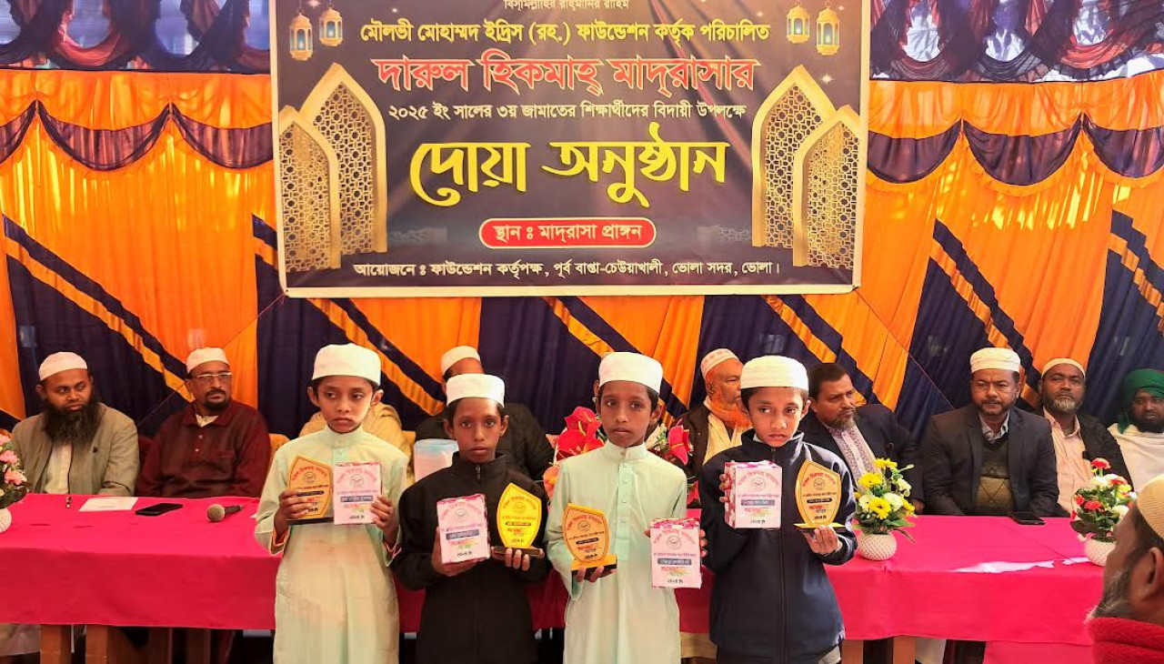 বাংলার কণ্ঠ প্রতিবেদক : ভোলায় মৌলবী মোহাম্মদ ইদ্রিস (রহ.) ফাউন্ডেশন কর্তৃক পরিচালিত দারুল হিকমাহ্ মাদরাসার এতিম শিক্ষার্থীদের বিদায়ী সংবর্ধনা প্রদান করা হয়েছে।