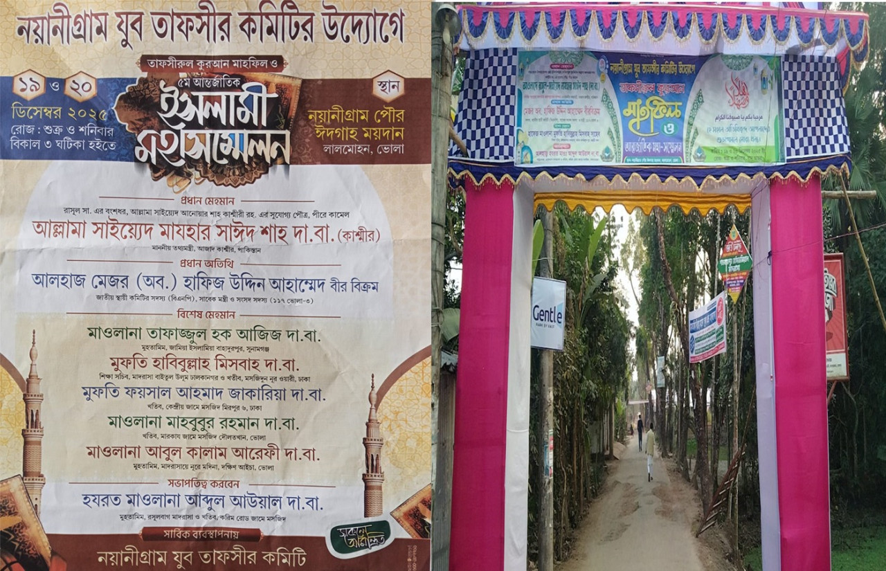 আকবর জুয়েল, লালমোহন: ভোলার লালমোহনে নয়ানীগ্রাম যুব তাফসীর কমিটির উদ্যোগে দুই দিনের ৫ম আন্তর্জাতিক ইসলামী মহা সম্মেলন শুরু হতে যাচ্ছে। নয়ানীগ্রাম পৌর ঈদগাহ ময়দানে আগামী ১৯ ও ২০ ডিসেম্বর শুক্র ও শনিবার বিকাল ৩টা থেকে এ সম্মেলন অনুষ্ঠিত হবে।