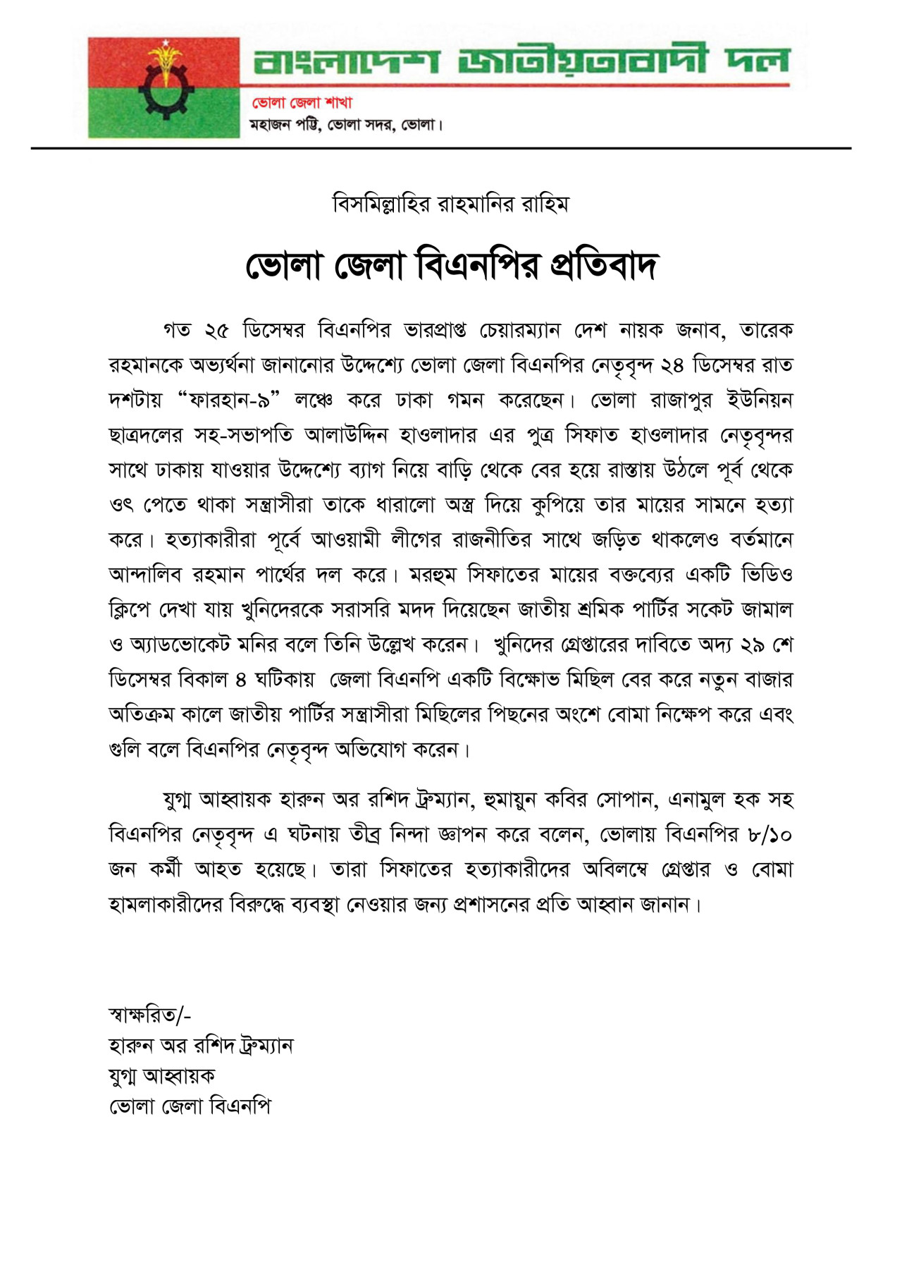 ভোলা রাজাপুর ইউনিয়ন ছাত্রদলের সহ-সভাপতি আলাউদ্দিন হাওলাদার এর পুত্র সিফাত হাওলাদার নেতৃবৃন্দর সাথে ঢাকায় যাওয়ার উদ্দেশ্যে ব্যাগ নিয়ে বাড়ি থেকে বের হয়ে রাস্তায় উঠলে পূর্ব থেকে ওৎ পেতে থাকা সন্ত্রাসীরা তাকে ধারালো অস্ত্র দিয়ে কুপিয়ে তার মায়ের সামনে হত্যা করে। হত্যাকারীরা পূর্বে আওয়ামী লীগের রাজনীতির সাথে জড়িত থাকলেও বর্তমানে আন্দালিব রহমান পার্থের দল করে। মরহুম সিফাতের মায়ের বক্তব্যের একটি ভিডিও ক্লিপে দেখা যায় খুনিদেরকে সরাসরি মদদ দিয়েছেন জাতীয় শ্রমিক পার্টির সকেট জামাল বলে তিনি উল্লেখ করেন। খুনিদের গ্রেপ্তারের দাবিতে ২৯ শে ডিসেম্বর বিকাল ৪ ঘটিকায় জেলা বিএনপি একটি বিক্ষোভ মিছিল বের করে নতুন বাজার অতিক্রম কালে জাতীয় পার্টির সন্ত্রাসীরা মিছিলের পিছনের অংশে বোমা নিক্ষেপ করে এবং গুলি করে বলে বিএনপির নেতৃবৃন্দ অভিযোগ করেন।