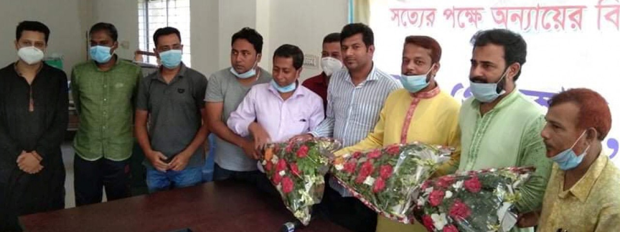 বাংলার কন্ঠ প্রতিবেদক : ভোলায় করোনা আক্রান্ত থেকে সুস্থ্য হওয়ায় সাংবাদিক ভোলা প্রেসক্লাবের দফতর সম্পাদক এটিএন বাংলা প্রতিনিধি মোঃ ছিদ্দিুল্লাহ, কালবেলা প্রতিনিধি মোঃ মনিরুল ইসলামকে সংবধিত ও ফুলের শুভেচ্ছা জানিয়েছে প্রেসক্লাব । এর আগে মানবজমিন প্রতিনিধি এডভোকেট মনিরুল ইসলাম ও চ্যানেল-২৪ প্রতিনিধি আদিল হোসেন তপুকে শুভেচ্ছা জানানো হয় । শনিবার দুপুরে প্রেসক্লাব মিলনায়তনে স্বাস্থ্যবিধি মেনে এ অনুষ্ঠান সম্পন্ন হয়ে থাকে। এ সময় প্রেসক্লাব কোষাধ্যক্ষ মোঃ মোকাম্মেল হক মিলনের সভাপতিত্বে বক্তব্য রাখেন প্রেসক্লাব সম্পাদক অমিতাভ অপু, এনটিভি প্রতিনিধি আফজাল হোসেন, বাংলাদেশ প্রতিদিন প্রতিনিধি জুন্নু রায়হান , মাছরাঙা টিভি প্রতিনিধি হাসিব রহমান , প্রেসক্লাব ক্রীড়া সম্পাদক কামরুল ইসলাম, একুশ টিভি প্রতিনিধি মেজবাহ উদ্দিন শিপু, আবৃত্তি শিল্পী আমাদের নতুন সময় প্রতিনিধি মশিউর রহমান পিংকু, সংবাদ প্রতিনিধি পুস্পেন্দু মজুমদার, সাংবাদিক ইকরামুল ইসলাম, মোঃ ইয়ামিন প্রমুখ। এ সময় প্রথিতযশা সাংবাদিক ও সম্পাদক লেখক রাহাত খানের মৃত্যুতে শনিবার ভোলা প্রেসক্লাবের পক্ষ থেকে শোক জানানো হয়েছে। এ সময় এক মিনিট নিরবতা পালন ও দোয়া অনুষ্ঠানে অংশ নেন সাংবাদিকরা। রাহাত খানের কর্মময় জীবন নিয়ে আলোচনাও করা হয়। অনুষ্ঠান উপস্থাপনায় ছিলেন, শিল্পী তালহা তালুকদার বাঁধন । পরে সকলের সুস্বাস্থ্য কামনা করে দোয়া অনুষ্ঠান পরিচালনা করেন একরাম হোসেন।