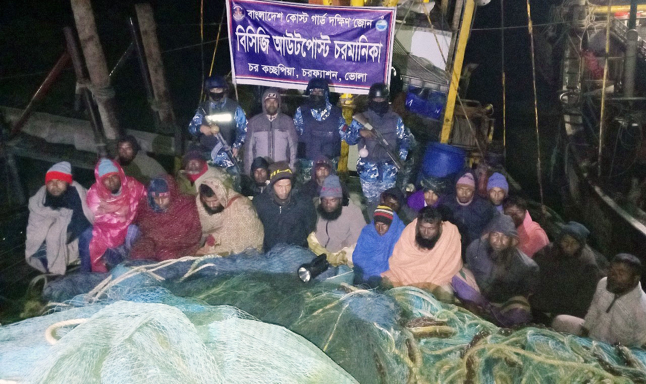 কোস্টগার্ডের পক্ষ থেকে এক প্রেস বিজ্ঞপ্তিতে জানানো হয়, গোপন সংবাদের ভিত্তিতে বৃহস্পতিবার ভোরে চরমানিকা কোস্টগার্ড আউটপোস্ট এর সদস্যরা ভোলার দুলারহাট আহম্মদপুরের মায়া ব্রীজ সংলগ্ন এলাকায় একটি বিশেষ অভিযান পরিচালনা করে। এ সময় উক্ত এলাকা হতে ২টি অবৈধ আর্টিসানাল ট্রলিং বোট জব্দ করা হয়। এ সময় জব্দকৃত ট্রলিং বোটে তল্লাশি চালিয়ে প্রায় ৩ লক্ষ ৫০ হাজার টাকা মূল্যের ৭ টি অবৈধ বেহুন্দী জালসহ ২০ জন জেলেকে আটক করা হয়। আটককৃত জেলেরা হচ্ছে,নুর নবী(৪০),মো: মফিজ (৪৭) ,মো: মোস্তফা (৩৫) , মো: নুরনবী (৫৫) , মো: আবুল কালাম (৬০), মো: আমজাদ হোসেন (২৫), মো: আব্দুর রহমান (৪৫),মো: হারুন (৪২) ,মো: হেলাল (২৫) ,মো: জাকির (৩০) ,মো: রায়হান (২৫), মো: মনির (৩৫), মো: নুর নবী (৩৫), মো: তারেক(১৯), মো: নিরব (৩৬), মো: মিজানুর (৪০), নুর আলম (৫০), নাজিমউদ্দীন (৩২) মো: ইউনুস (৩৫), মো: রাসেল (২৭)।পরে জব্দকৃত বোট ও জাল এবং আটককৃত ব্যক্তিদের বিরুদ্ধে আইনানুগ ব্যবস্থা গ্রহণ করা হয়।