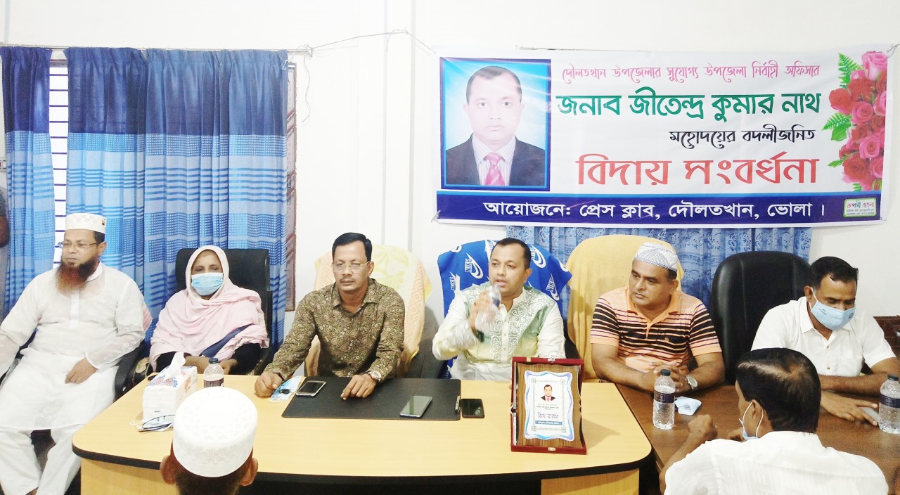 দৌলতখান প্রতিনিধি : ভোলার দৌলতখান উপজেলা নির্বাহী কর্মকর্তা জিতেন্দ্র কুমার নাথকে দৌলতখান প্রেসক্লাব থেকে বিদায়ী সংবর্ধনা দেয়া হয়েছে। শনিবার সন্ধ্যায় দৌলতখান প্রেসক্লাবে বদলী জনিত কারণে এ বিদায় সংবর্ধনা দেয়া হয়। এ ছাড়া উপজেলায় কর্মরত বিভিন্ন দফতরের কর্মকর্তা কর্মচারী, ইউপি চেয়ারম্যান ,সাংবাদিক, সামাজিক সংগঠন, রাজনীতিবিদ, পেশাজীবি এবং বিশিষ্ট নাগরিকরা আলাদাভাবে তাকে এ সংবর্ধনা দেন।