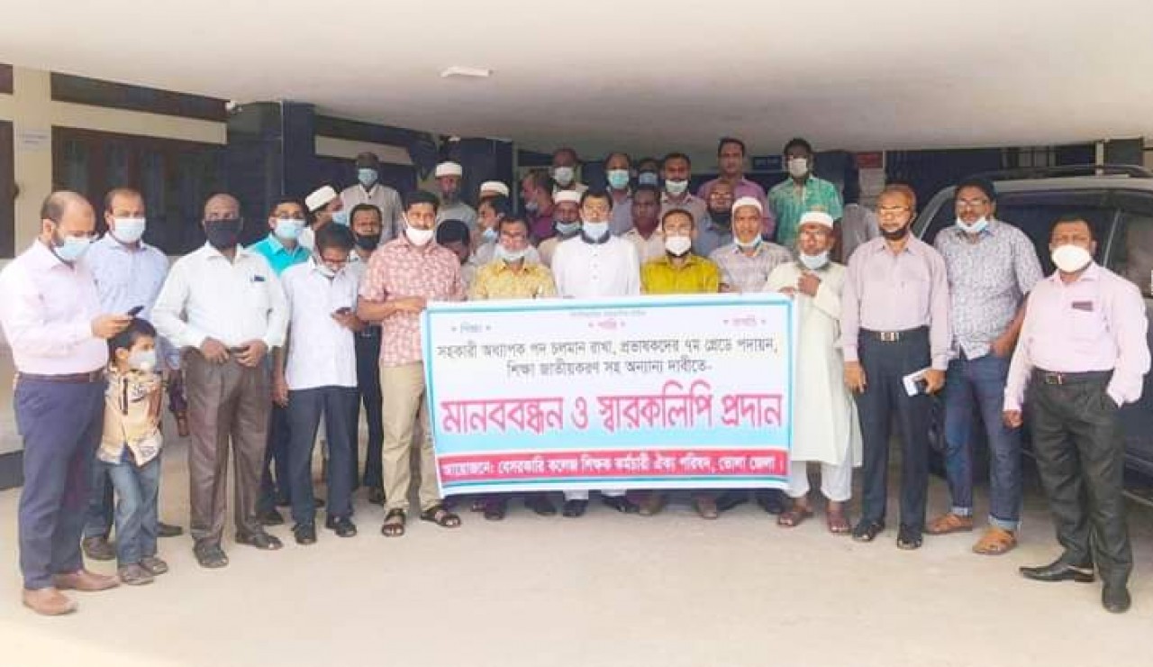 মঙ্গলবার (৮ সেপ্টেম্বরে) সকালে ভোলা জেলা প্রশাসক কার্যালয়ের সামনে শিক্ষক কর্মচারী ঐক্য পরিষদ ভোলা জেলা কমিটির ব্যানারে ওই মানববন্ধন অনুষ্ঠিত হয়। এতে জেলার বিভিন্ন বেসরকারি কলেজের শতাধিক শিক্ষক অংশ নেন। মানববন্ধন শেষে শিক্ষা মন্ত্রী বরাবর লিখিত স্বারকলিপি জেলা প্রশাসক মোঃ মাসুদ আলম সিদ্দিকের মাধ্যমে দেয়া হয়।
