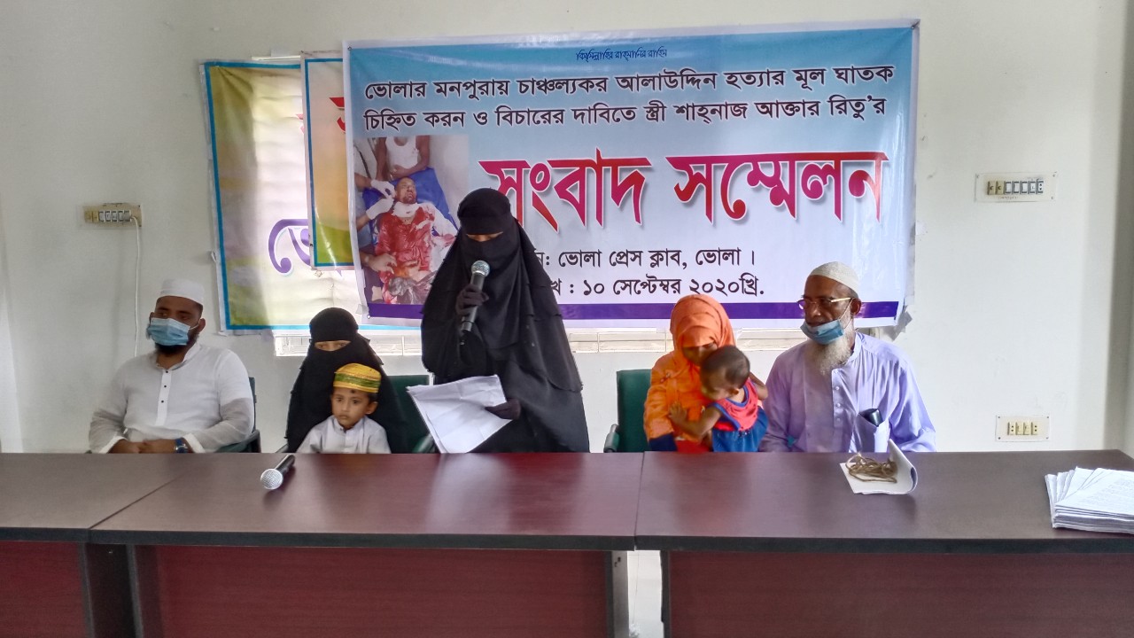 সংবাদ সম্মেলনে লিখিত অভিযোগ তুলে ধরেন আলাউদ্দিন মোল্লার স্ত্রী শাহনাজ আক্তার রিতু । শিশু সন্তান নিয়ে অভিযোগ তুলে ধরে এ সময় কান্নায় ভেঙে পড়েন শাহনাজ। তিনি বলেন, গত বছরের ৬ অক্টোবর ব্যবসা প্রতিষ্ঠান থেকে বাড়ি ফেরার পথে আলাউদ্দিনকে রাতে গলা কেটে হত্যা করা হয়। স্বামী হত্যা মামলার বাদি তার হওয়ার কথা ছিল। কিন্তু তাকে না জানিয়ে বাদি হয়েছেন আলাউদ্দিনের ভাই মোঃ জাফর। আলাউদ্দিন কম্পিউটার চালাতে পারতেন না। তাই তার লাখ লাখ টাকার লেন দেন পোষ্টিং দিতেন পাশ^বর্তী বাড়ির মাদ্রাসা শিক্ষক শামিম মাস্টার। ওই শামিম মাস্টার জানতেন আলাউদ্দিনের সকল টাকার হিসাব। ঘটনার রাতে আলাউদ্দিনের গলায় ছুরিকাঘাত করার পর আলাউদ্দিন বাড়ির দিকে ছুটে আসেন। তাকে হাসপাতালে মটর সাইকেল যোগে নেয়ার পথে পুনরায় হত্যা নিশ্চিত করা হয়। ওই সময় শামিম মাস্টার কোথায় ছিলেন । তার ভূমিকা কি ছিল। এমন নানা প্রশ্ন তুলে ওই হত্যার নেপথ্যে শামীম মাষটারের তার হাত ছিলো বলে অভিযেগ করেন। অথচ প্রথম থেকে নিজেকে আড়াল করে মামলা অন্যদিকে নেয়ার চেস্টা চালায় এরা। সঠিক তদন্ত হলে অনেক রহস্য বের হবে উল্লেখ করে সংবাদ সম্মেলনে শাহনাজ আরো অভিযোগ করেন আলাউদ্দিন ডাচবাংলাসহ, বিভিন্ন ব্যবসা ছিল। তিনি আরো অভিযোগ করেন, তাদের ব্যবসা প্রতিষ্ঠান এজেন্ট ব্যাংকে ওই দিন ৬০ /৭০ লাখ টাকা ছিল। কাগজের কাটুন ভর্তি এই সব টাকা হাতিয়ে নেন দেবর জামালসহ শামিম মাস্টাররা। এই সব টাকার হিসাব চাওয়ায় শ্বশুর , দেবর ও শামিম মাস্টার তাকে বাড়ি থেকে উৎখাত করতে ওই বাড়ি বিক্রি করার চেস্টা চালায়। উপায়ন্ত না পেয়ে মনপুরা উপজেলা চেয়ারম্যানের কাছে হিসাবের জন্য লিখিত আবেদন করি। উপজেলা চেয়ারম্যানের নেতৃত্বে ৪ ইউপি চেয়ারম্যানসহ একটি টিম কয়েক দফা তদন্তে আলাউদ্দিনের রেখে যাওয়া কোটি টাকার হিসেবে নয়ছয় ও লোপাট করার প্রমান পেয়েছেন। যার লিখিত প্রতিবেদন তুলে ধরেন শাহানাজ আক্তার। শাহনাজ অভিযোগ করেন, তিনি যাতে স্বামী হত্যার বিচার না চান এবং সম্পত্তির ভাগ না চান, এ জন্য তার ১০ বছর বয়সী মেঝ মেয়েকে দুই দফা অপহরণ করা হয়। পরে ফেরত দিয়ে যায়। বার বার ভয়ভীতি দেখানো হচ্ছে। এ অবস্থায় শাহনাজ আক্তার নিরাপত্তাহীনতায় ভুগছেন বলেও জানান। স্বামীর হত্যার বিচার পাওয়ার বিষয় যেমনি অনিশ্চিত তেমনি সন্তানদের অধিকার ও ভবিষ্যতও অনিশ্চিত হয়ে পড়েছেন শাহনাজ আক্তার। অপর দিকে আলাউদ্দিনের স্ত্রী শাহনাজ আক্তার রিতু বাদী হয়ে স্বামীর হত্যা নিয়ে গত ৩ সেপ্টেম্বর মনপুরা সিনিয়র জুডিশিয়াল ম্যাজিষ্ট্রেট আদালতে দশজনকে আসামী করে পৃথক একটি মামলা করেন। ওই মামলায় শ্বশুর মজিবল হক মোল্লা, দেবর জামাল, জাফর, মহসিন, মাইনুদ্দিন, সামসুদ্দিন, প্রতিব
