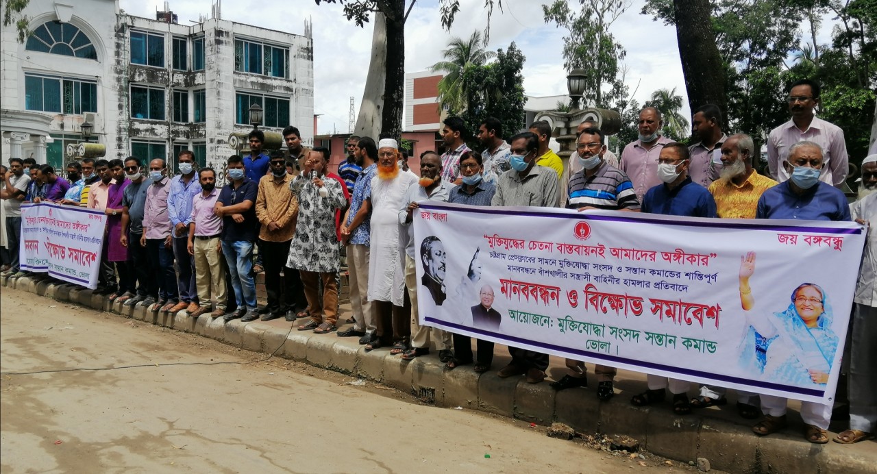 ভোলা জেলা মুক্তযোদ্ধা সংসদ সন্তান কমান্ডের আহবায়ক হামিদুর রহমান হাসিবের সভাপতিত্বে মানববন্ধন ও প্রতিবাদ সমাবেশে প্রধান অতিথির বক্তব্য রাখেন, ভোলা জেলা মুক্তিযোদ্ধা সংসদ কমান্ডের সাবেক কমান্ডার দোস্ত মাহমুদ।বিশেষ অতিথি হিসেবে বক্তব্য রাখেন, জেলা মুক্তিযোদ্ধা কমান্ডের সাবেক ডেপুটি কমান্ডার মো. শফিকুল ইসলাম, সদর উপজেলা মুক্তিযোদ্ধা সংসদের সাবেক কমান্ডার অহিদুর রহমান।