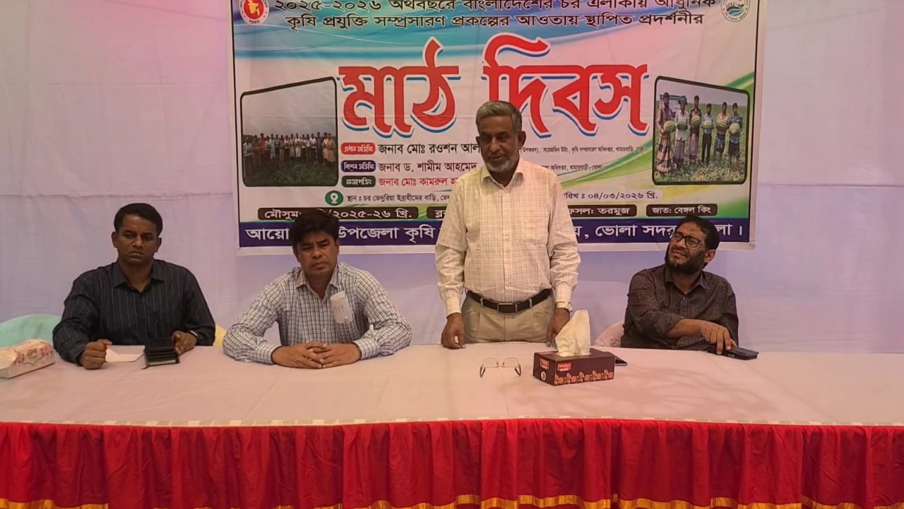 বাংলার কন্ঠ প্রতিবেদক : ভোলা সদর উপজেলায় আধুনিক কৃষি প্রযুক্তি সম্প্রসারণ প্রকল্পের আওতায় স্থাপিত প্রদর্শনী প্লটের মাঠ দিবস অনুষ্ঠিত হয়েছে। ২০২৫–২০২৬ অর্থবছরে বাস্তবায়নাধীন এ কর্মসূচির অংশ হিসেবে আজ বুধবার (৪ মার্চ) ভোলা কৃষি বিভাগের আয়োজনে দক্ষিণ ভেদুরিয়া এলাকার মজিবর হাওলাদারের বাড়ির উঠানে এই মাঠ দিবস পালন করা হয়।