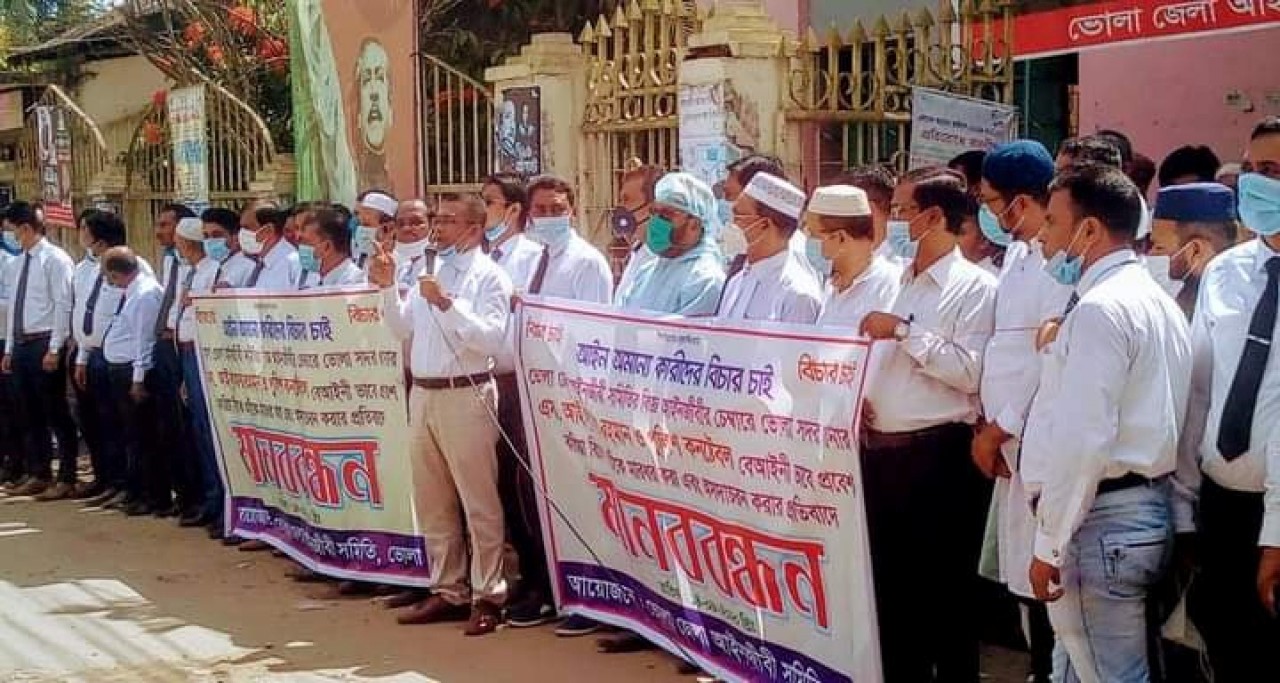 বাংলার কণ্ঠ প্রতিবেদক : ভোলা জেলা আইনজীবী সমিতির সভাপতি’র চেম্বারে প্রবেশ করে এক বিচার প্রার্থীকে মারধর ও পুলিশ দিয়ে আটকের চেষ্টার ঘটনার প্রতিবাদে সোমবার মানববন্ধনসহ সমাবেশ করেছেন আইনজীবীরা। জেলা বারের সামনে সকাল সাড়ে ১০ টায় মানববন্ধন শুরু হয়। পরে প্রতিবাদ সমাবেশে বক্তব্য রাখেন জেলা আইনজীবী সমিতির সভাপতি এ্যাডভোকেট ছালাউদ্দিন হাওলাদার, আইনজীবী সমিতির সম্পাদক এ্যাডভোকেট নুরল আমিন নুরনবী, সিনিয়র আইনজীবী রবীন্দ্র নাথ দে, এ্যাডভোকেট ড. আমিনুল ইসলাম বাছেদ, এ্যাডভোকেট শাহাদাত হোসেন শাহীনসহ সিনিয়র জুনিয়ার আইনজীবীরা। শনিবার রাতে শহরের উকিলপাড়ায় আইনজীবী সমিতির সভাপতির চেম্বারে একজন বিচারপ্রার্থী মিজানুর রহমান মিজান অবস্থান করছিলেন, ওই সময় রিফা বেগম নামের এক নারী কয়েক সন্ত্রাসীকে নিয়ে মিজানকে মারধর করতে শুরু করে। এমন কি পুলিশ নিয়ে তাকে আটকের চেস্টা করে। বিষয়টি নিয়ে আইনজীবীদের মধ্যে ক্ষোভ দেখা দেয়। সোমবারের মানববন্ধনে ওই পুলিশের এসআই’র বিরুদ্ধে ব্যবস্থা নেয়ারও দাবি জানান আইনজীবীরা। বিচারপ্রার্থী মিজানুর রহমান জানান, তিনি রিফা বেগমের দায়ের করা হাঁসচুরি মামলায় আটক হয়ে ছিলেন। পরে জামিনে বেড় হয়ে মামলার বিষয়ে এ্যাডভোকেট ছালাউদ্দিন হাওলাদারের চেম্বারে আসেন।