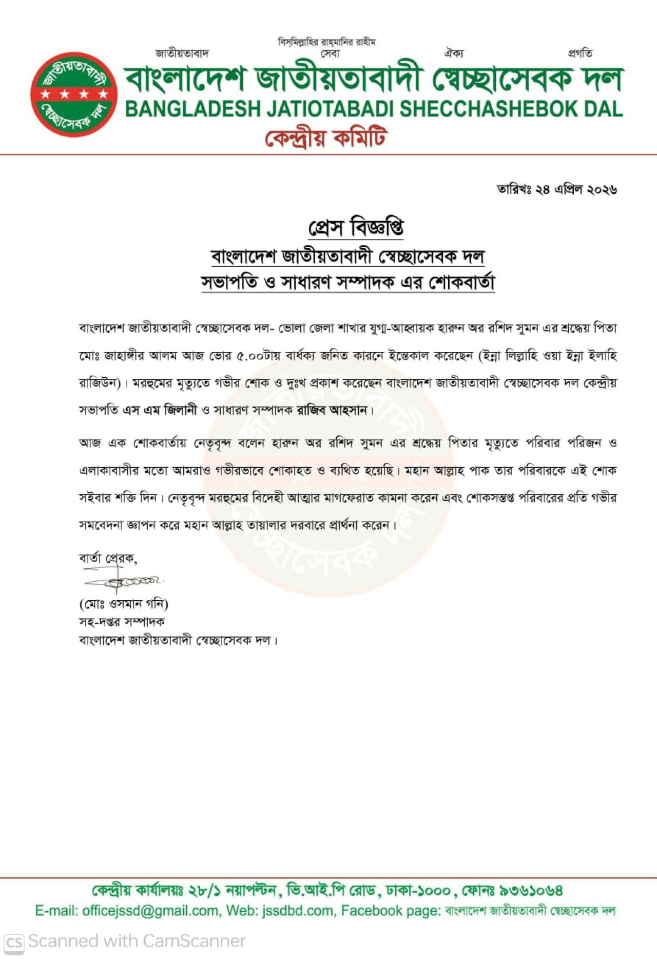 বাংলার কণ্ঠ ডেস্ক : ভোলা জেলা স্বেচ্ছাসেবক দলের যুগ্ম আহ্বায়ক হারুন অর রশীদ সুমনের পিতা মোঃ জাহাঙ্গীর আলমের ইন্তেকালে গভীর শোক ও দুঃখ প্রকাশ করেছে বাংলাদেশ জাতীয়তাবাদী স্বেচ্ছাসেবক দল (কেন্দ্রীয় কমিটি)।