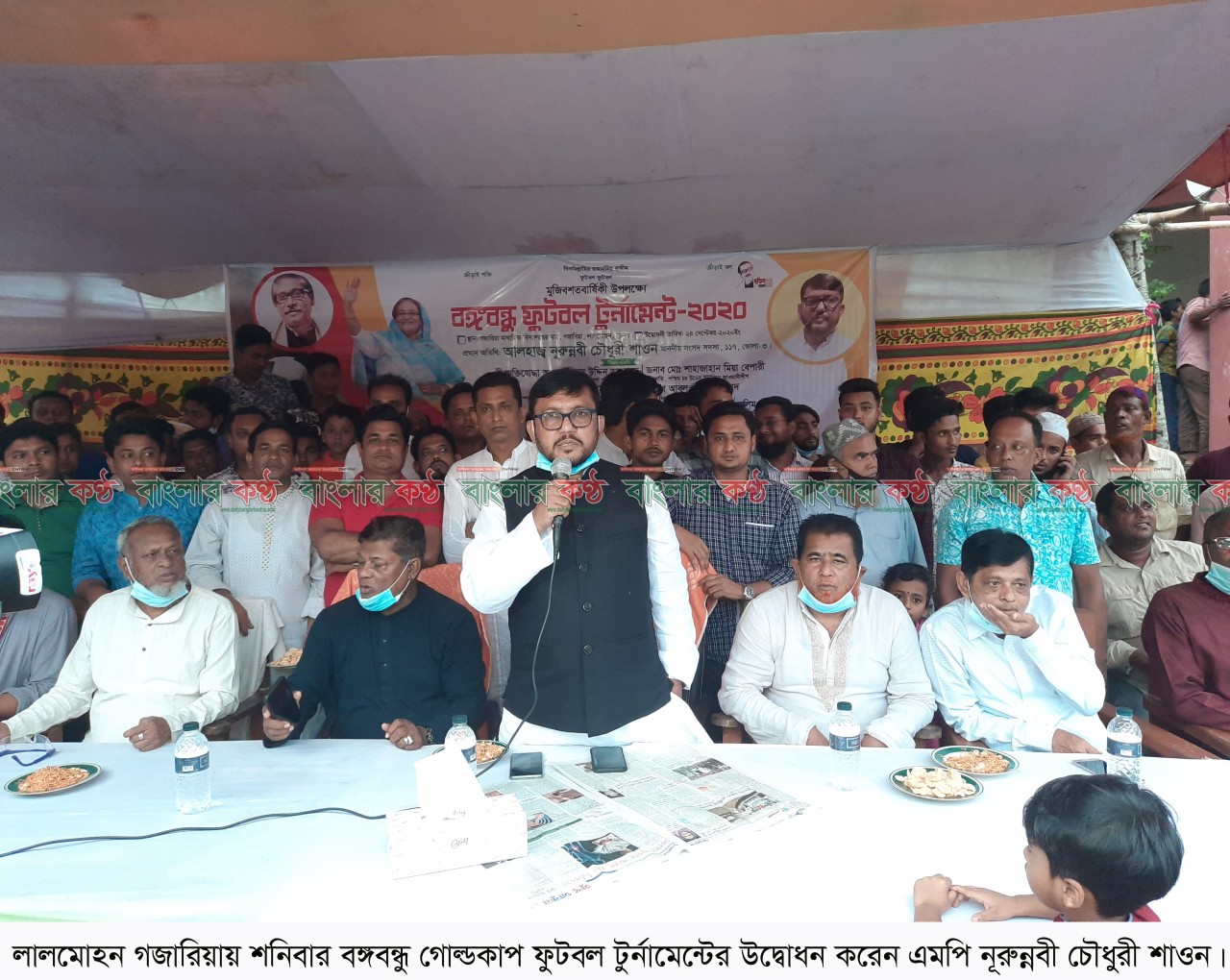 মোঃ জসিম জনি/ওমর রায়হান অন্তর, লালালমোহন : ভোলা-৩ (লালমোহন-তজুমদ্দিন) আসনের সংসদ সদস্য নূরুন্নবী চৌধুরী শাওন বলেছেন, সর্বকালের সর্বশ্রেষ্ঠ বাঙালি জাতির পিতা বঙ্গবন্ধু শেখ মুজিবুর রহমান বাংলাদেশের ক্রীড়াঙ্গনকে এগিয়ে নিতে সময়োপযোগী নানা পদক্ষেপের মাধ্যমে ক্রীড়াঙ্গনে বৈপ্লবিক পরিবর্তনের শুভসূচনা করেছিলেন। বাংলাদেশের ক্রীড়াঙ্গনে আধুনিকতার ছোঁয়া আসে জাতির পিতা বঙ্গবন্ধু শেখ মুজিবুর রহমানের হাত ধরে। স্বাধীনতা পরবর্তী সময়ে দেশের ক্রীড়া ক্ষেত্রে জাতির পিতার অবদান ছিল চোখে পড়ার মতো। শনিবার লালমোহন গজারিয়া হাই স্কুল মাঠে বঙ্গবন্ধুর জন্মশত বার্ষিকী উপলক্ষ্যে গজারিয়া খেলোয়াড় কল্যাণ সংস্থার আয়োজনে বঙ্গবন্ধু গোল্ডকাপ ফুটবল টুর্নামেন্টের উদ্বোধনকালে তিনি একথা বলেন। এসময় এমপি শাওন আরো বলেন, খেলাধুলার মাধ্যমে শরীর ও মন ঠিক থাকে। মাদক থেকে তরুন সমাজ দুরে থাকে। খেলাধুলা আছে বলেই সমাজে অপরাধ কম হচ্ছে। সুন্দর সমাজ গড়তে খেলাধুলা ছাড়া বিকল্প নেই। লালমোহনের ঝিমিয়ে পড়া ক্রীড়াঙ্গণকে উজ্জীবিত করতে নিয়মিত খেলা ধুলার আয়োজন করতে হবে। প্রতি বছর যাতে খেলাধুলা অনুষ্ঠিত হয় আমরা সেই ব্যবস্থা করবো। প্রতিটা বিদ্যালয়ের মাঠকে সংস্কার করে খেলার উপযুক্ত করে তুলবো।