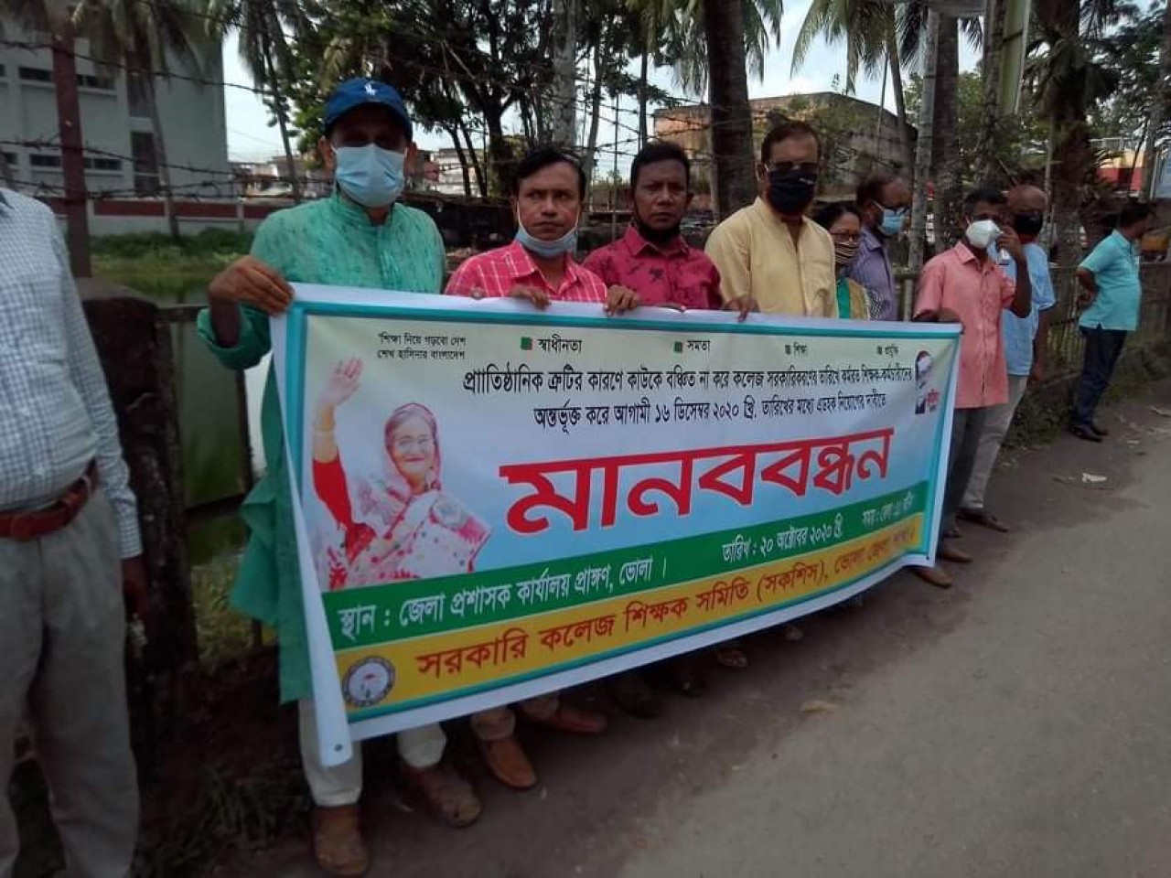 মঙ্গলবার সকালে ভোলা জেলা প্রশাসক কার্যালয়ের সম্মুখে কেন্দ্রী কমিটি ঘোষিত কর্মসূচির অংশ হিসেবে সরকারি কলেজ শিক্ষক সমিতি (সকশিস) ভোলা জেলা কমিটির আহ্বানে এ মানববন্ধন ও সমাবেশ অনুষ্ঠিত হয়।