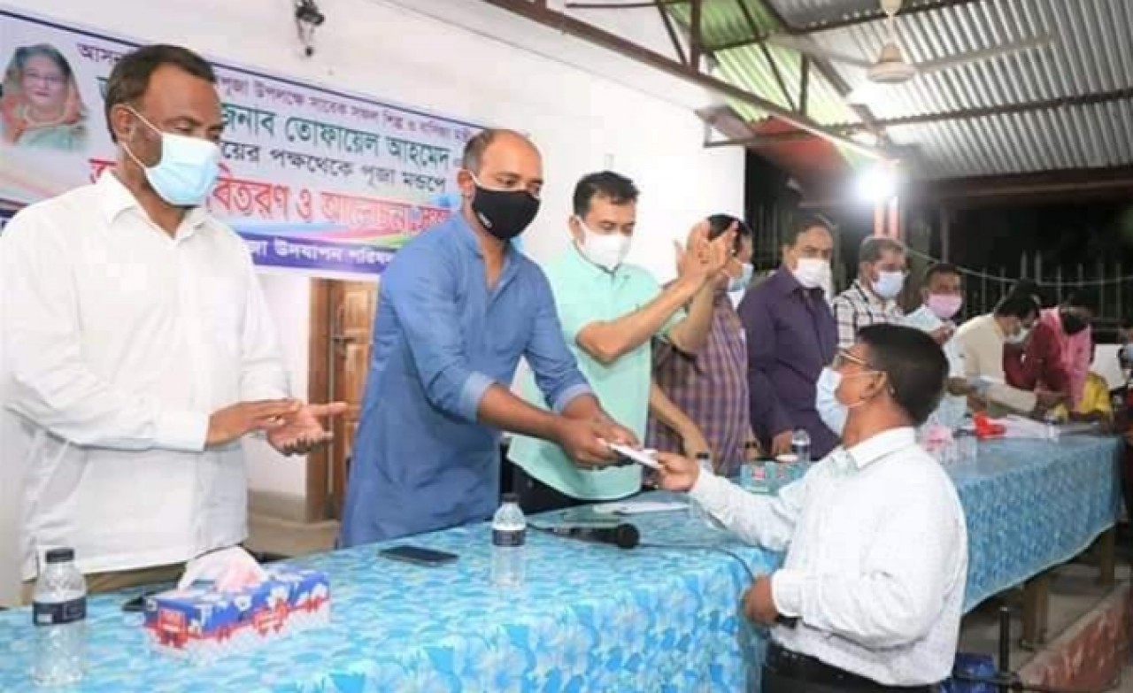 বাংলার কণ্ঠ প্রতিবেদক : ভোলায় এবার শারদীয় উৎসবের জন্য জেলা সদরের ২৮টি দুর্গাপূজা মন্ডপে আর্থিক অনুদান দিয়েছেন সাবেক শিল্প ও বাণিজ্যমন্ত্রী তোফায়েল আহমেদ। সোমবার রাতে তোফায়েল আহমেদের পক্ষে জেলা আওয়ামী লীগ নেতৃবৃন্দ পূজা উদযাপন পরিষদের মাধ্যমে এ অনুদানের টাকা বিতরণ করেন। এ সময় উপস্থিত ছিলেন জেলা আওয়ামী লীগ সম্পাদক জেলা পরিষদ চেয়ারম্যান আবদুল মমিন টুলু, সদর উপজেলা আওয়ামী লীগ সভাপতি ও উপজেলা চেয়ারম্যান মোশারফ হোসে, উপজেলা আওয়ামী লীগ সম্পাদক নজরুল ইসলাম গোলদার, জেলা আওয়ামী লীগের যুগ্ম সম্পাদক জহরুল ইসলাম নকিব, জেলা আওয়ামী লীগ সাংগঠনিক সম্পাদক মইনুল হোসেন বিপ্লব, উপজেলা ভাইস চেয়ারম্যান মোঃ ইউনুছ, ভোলা জেলা পূজা উদয্পান পরিষদের সভাপতি গৌরাঙ্গ চন্দ্র দে, সম্পাদক অসীম সাহা, সাংগঠনিক সম্পাদক প্রণয় সাহাসহ পূজা মন্ডপগুলোর প্রতিনিধিরা। প্রতিটি পূজা মন্ডপ পেয়েছে প্রায় ৫০ হাজার টাকা।