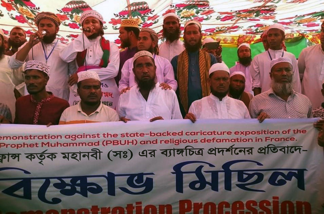 তজুমদ্দিন প্রতিনিধি : ফ্রান্সে রাষ্ট্রিয় পৃষ্ঠপোষকতায় বিশ্বনবী হযরত মুহাম্মদ (স:) কে অবমাননা করার প্রতিবাদে ফ্রান্সের সকল পণ্য নিষিদ্ধ করে বর্জনের দাবিতে ভোলার তজুমদ্দিনে সোনাপুর ইউনিয়নের বিচ্ছিন্ন চর শাওনে বিক্ষোভ ও প্রতিবাদ সমাবেশ অনুষ্ঠিত হয়েছে। সমাবেশে সোনাপুর ইউনিয়নের বিভিন্ন এলাকা থেকে প্রায় ২ হাজার তৌহিদী জনতা অংশ গ্রহণ করেন। শনিবার বিকাল সকাল ১১টায় ইউনিয়নের সর্বস্তরের সাধারণ মানুষ প্রতিবাদ মিছিল নিয়ে চর শাওনের চেয়ারম্যান বাজারে প্রতিবাদ সমাবেশ করেন। চর শাওন তৌহিদী জনতার আয়োজনে প্রতিবাদ বিক্ষোভ সমাবেশে বক্তারা ফ্রান্সের সকল পণ্য বাংলাদেশে নিষিদ্ধ ঘোষণা করার দাবি জানান। প্রতিবাদ সমাবেশে বক্তৃতা করেন, মাওঃ মোঃ নাঈম, মাওঃ মোঃ আব্দুল মন্নান, মাওঃ মোঃ আব্বাস, মাওঃ মোঃ সাহেদ, মাওঃ মোঃ হান্নান, মাওঃ মোঃ মাকসুদ, স্থানীয় সুলতান মাঝি, আজিজ স্বর্ণকার, ইলিয়াছ মিয়া, জাকির হোসেন, মিজান ডাক্তার।