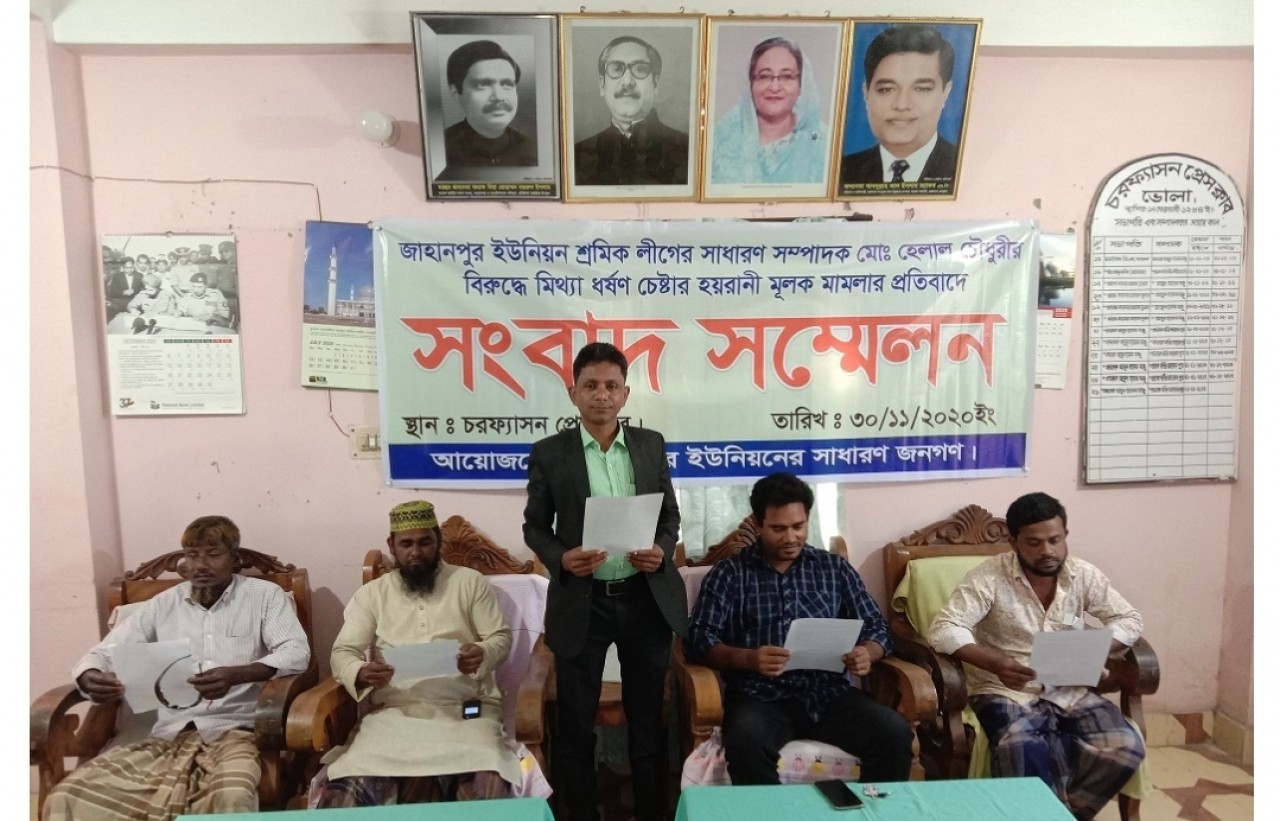 সোমবার (৩০নভেম্বর) বিকেলে চরফ্যাসন প্রেসক্লাবে আয়োজিত সংবাদ সম্মেলনে এমন অভিযোগ করেন হেলাল উদ্দিন চৌধুরী। হেলাল উদ্দিন চৌধুরী অভিযোগ করেন,২০১৮ সালে ইলিশের মৌসুমে তিনি জাহানপুর ৯নং ওয়ার্ডের জেলে হাসেম মাঝিকে ষ্ট্যাম্পে চুক্তির মাধ্যমে ১৩লাখ টাকা জেলে দাদন দেন। দুই বছর হয়ে গেলেও দাদনের ওই টাকা ফেরত না দেয়ায় হেলালের সঙ্গে হাসেম মাঝির বিরোধ চলমান আছে। তিনি আরও বলেন এ বিরোধের জের ধরেই হাসেম মাঝি ও তার পরিবার পাওনা টাকা আতœসাতের অশুভ উদ্দেশ্যে আমাকে মামলায় জড়ানোর হুমকি দিয়ে আসছিলেন। মামলায় জাড়ানোর হুমকির পরপরই গত ৯অক্টোবর শুক্রবার রাতে হাসেম মাঝির জাহানপুরের বসত ঘরে ঢুকে তার স্ত্রীকে ধর্ষণ চেষ্টার অভিযোগ তোলেন। অভিযোগ তোলার প্রায় এক মাস পর এলাকার কিছু কুচক্রী মহলের প্ররোচনায় গত ১২ নভেম্বর আমাকে আসামী করে তার স্ত্রীকে ধর্ষণ চেষ্টার অভিযোগ তুলে ভোলার নারী ও শিশু নির্যাতন দমন ট্রাইব্যুনালে একটি কমপ্লেইন পিটিশন দায়ের করান। যার