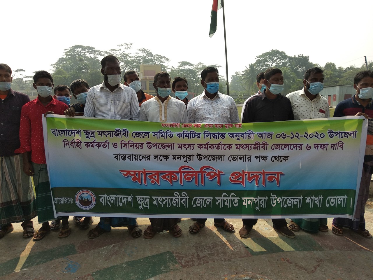 মানববন্ধনে জেলেদের পক্ষে দাবী তুলে বক্তব্যে ক্ষুদ্র মৎস্যজীবি সমিতির সভাপতি নাসির মহাজন বলেন, সকল নদীর মোহনায় ক্যাপিটাল ড্রেজিং এর মাধ্যমে নদী খনন করতে হবে। জেলেদের এফ আই ডি কার্ড সংশোধনে মৎস্যজীবি নেতাদের অংশগ্রহন সহ ঘূর্ণীঝড়, জলোউছ¡াসে ও জলদস্যুদের হাতে নিহত জেলে পরিবারকে ৫ লক্ষ টাকা করে আর্থিক সহায়তা সহ জীবন বীমার চালু করার দাবী করে ৬ দফা দাবী তুলে ধরেন। এই সময় অন্যান্যের মধ্যে উপস্থিত ছিলেন, ক্ষুদ্র মৎস্যজীবি সমিতির সম্পাদক মামুনুর রশীদ, মৎস্যজীবিলেিগর সম্পাদক কবির মাঝি, মৎস্যজীবি নেতা বাছেদ মেম্বার, নুর আলম মাঝি সহ অন্যান্যরা।