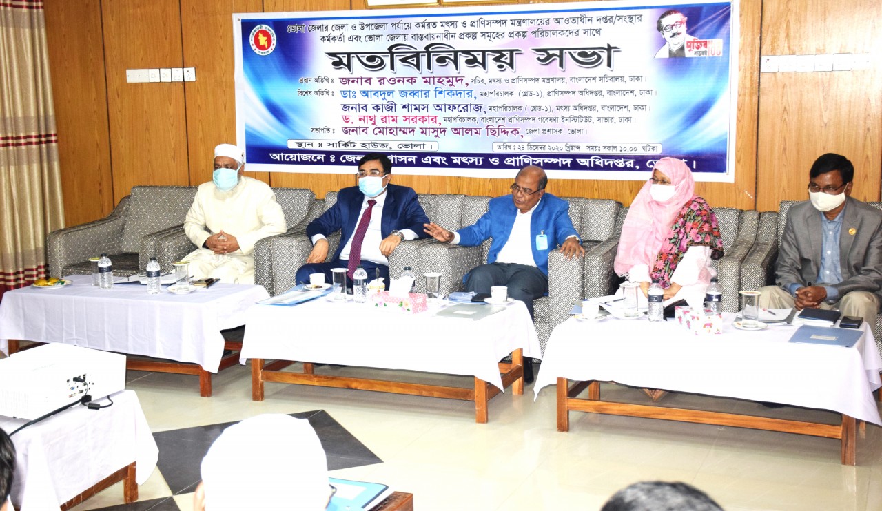 ভোলা জেলা প্রশাসন ও মৎস্য ও প্রাণি সম্পদ অধিদপ্তর ভোলা জেলা যৌথ ভাবে এই সভার আয়োজন করেন। সভায় সভাপতিত্ব করেন ভোলা জেলা প্রশাসক মো: মাসুদ আলম ছিদ্দিক। এসময় বিশেষ অতিথি হিসাবে উপস্থিত ছিলেন প্রাণি সম্পদ অধিদপ্তর এর মহাপরিচালক আবদুল জব্বার শিকদার,মৎস্য অধিদপ্তর এর মহাপরিচালক কাজী শামস আফরোজ,বাংলাদেশ প্রাণিসম্পদ গবেষনা ইনিস্টিটিউট এর মহাপরিচালক ড.নাথু রাম সরকার।
