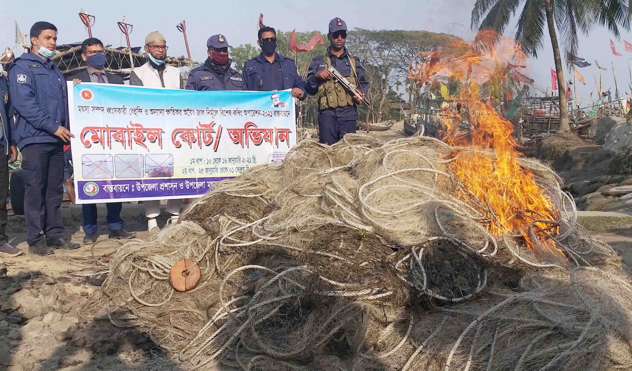 তজুমদ্দিন প্রতিনিধি : ভোলার তজুমদ্দিনের মেঘনায় উপজেলা মৎস্য অফিস ও কোষ্টগার্ডের যৌথ অভিযানে ১০ হাজার মিটার অবৈধ জাল ও ১৪টি লোহার নোঙ্গর জব্দ করা হয়। পরে আটক জাল আগুনে পুড়ে ধ্বংস করা হয় এবং নোঙ্গরগুলি নিলামে বিক্রি করা হয়।