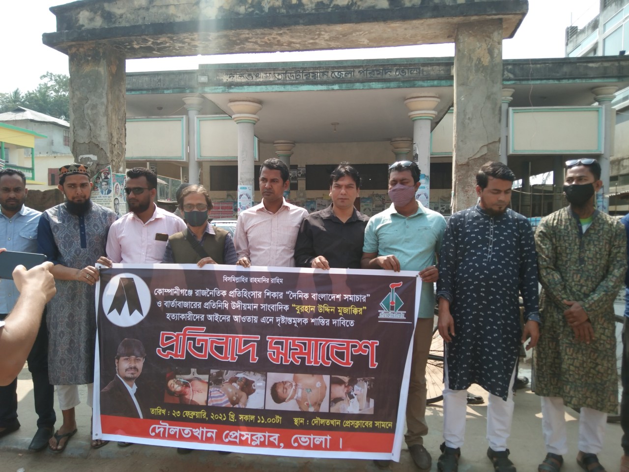 নোয়াখালীর কোম্পানীগঞ্জে সাংবাদিক বোরহান উদ্দিন মুজাক্কির হত্যার বিচার দাবিতে ভোলার দৌলতখান প্রেসক্লাবের উদ্যোগে সাংবাদিক সমাবেশ ও প্রতিবাদ সভা অনুষ্ঠিত হয়েছে। মঙ্গলবার সকাল এগারোটায় দৌলতখান দক্ষিণ বাজারে প্রেসক্লাবের সামনের সড়কে এ সমাবেশ করা হয়। পরে প্রেসক্লাব মিলনায়তনে এক প্রতিবাদ সভা অনুষ্ঠিত হয়। এ সময় প্রেসক্লাবের সিনিয়র সহ সভাপতি এম এ তাহেরের সভাপতিত্বে বক্তব্য রাখেন দৌলতখান সরকারি আবু আবদুল্লা কলেজের সাবেক ভারপ্রাপ্ত অধ্যক্ষ প্রেসক্লাবের সাবেক সভাপতি শ.ম ফারুক, সহ সভাপতি জাকির আলম, প্রেসক্লাব সম্পাদক মেহেদী হাসান শরিফ, যুগ্ম সম্পাদক মিজানুর রহমান, সাংবাদিক সাগর চৌধুরী প্রমূখ। চরফ্যাশন প্রতিনিধি জানান, নোয়াখালীর সাংবাদিক বোরহান উদ্দিন মুজাক্কিরকে নির্মমভাবে গুলি করে হত্যার প্রতিবাদে চরফ্যাশনে মানববন্ধন ও প্রতিবাদ সমাবেশ পালন করেছে উপজেলার সর্বস্থরের সাংবাদিক নেতৃবৃন্দ।