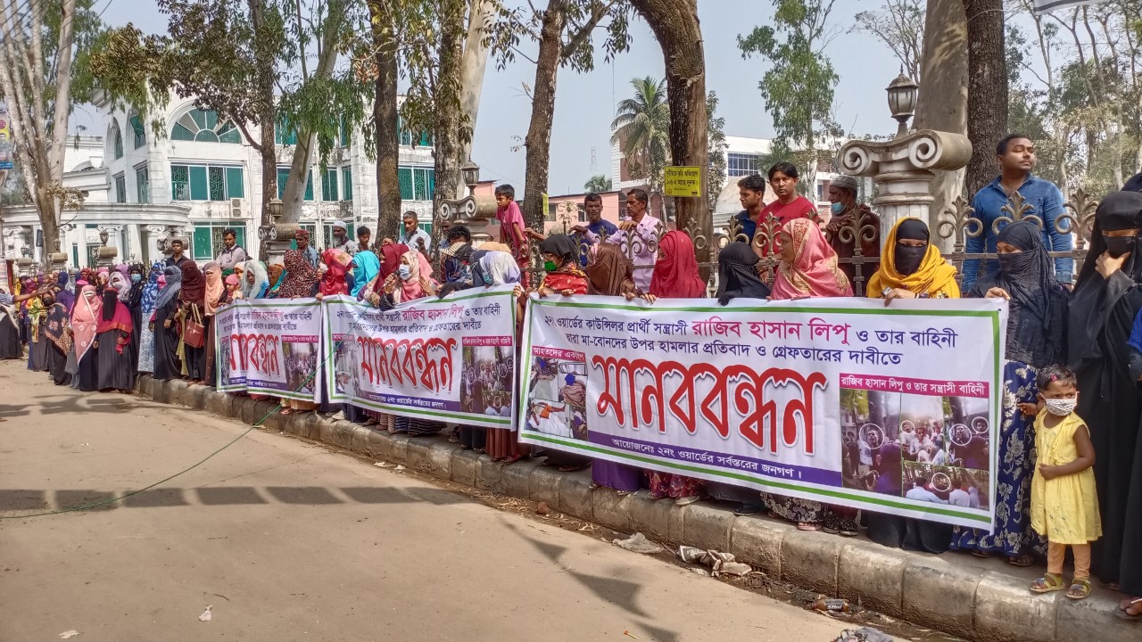 বাংলার কণ্ঠ প্রতিবেদক : আসন্ন পঞ্চম ধাপে ভোলা পৌর নির্বাচনে ২নং ওয়ার্ডের কাউন্সির প্রার্থী মিজানুর রহমান ও রাজিব হোসেন লিপুর কর্মীদের মধ্যে উত্তেজনা চলছে। কাউন্সির প্রার্থী মিজানুর রহমানের কর্মী সমর্থকদের উপর প্রতিপক্ষ কাউন্সির প্রার্থী রাজিব হোসেন লিপুর কর্মীদের হামলার ঘটনায় বৃহস্পতিবার সকালে মানববন্ধন বিক্ষোভ মিছিল হয়েছে। ভোলা প্রেসক্লাবের সামনে পৌর সভার ২নং ওয়ার্ডের জনগনের পক্ষ থেকে কয়েক শত নারী মানববন্ধন ও বিক্ষোভ সমাবেশ করেছে। এ সময় তারা অভিযোগ করেন, গত মঙ্গলবার অফিসার পাড়া এলাকায় কাউন্সিলর প্রার্থী মিজানুর রহমানের নারী কর্মীরা গনসংযোগে বাধা দিয়ে তাদের উপর প্রতিপক্ষ রাজিব হাসান লিপুর কর্মীরা হামলা চালিয়ে ৭/৮জনকে মারধর করে। এতে নারী ও শিশুসহ কয়েক জন আহত হয়। কিন্তু এঘটনায় থানায় অভিযোগ দিলেও কোন ব্যবস্থা নেয়া হয়নি। তাই দ্রæত বিচার দাবী জানানো হয়।