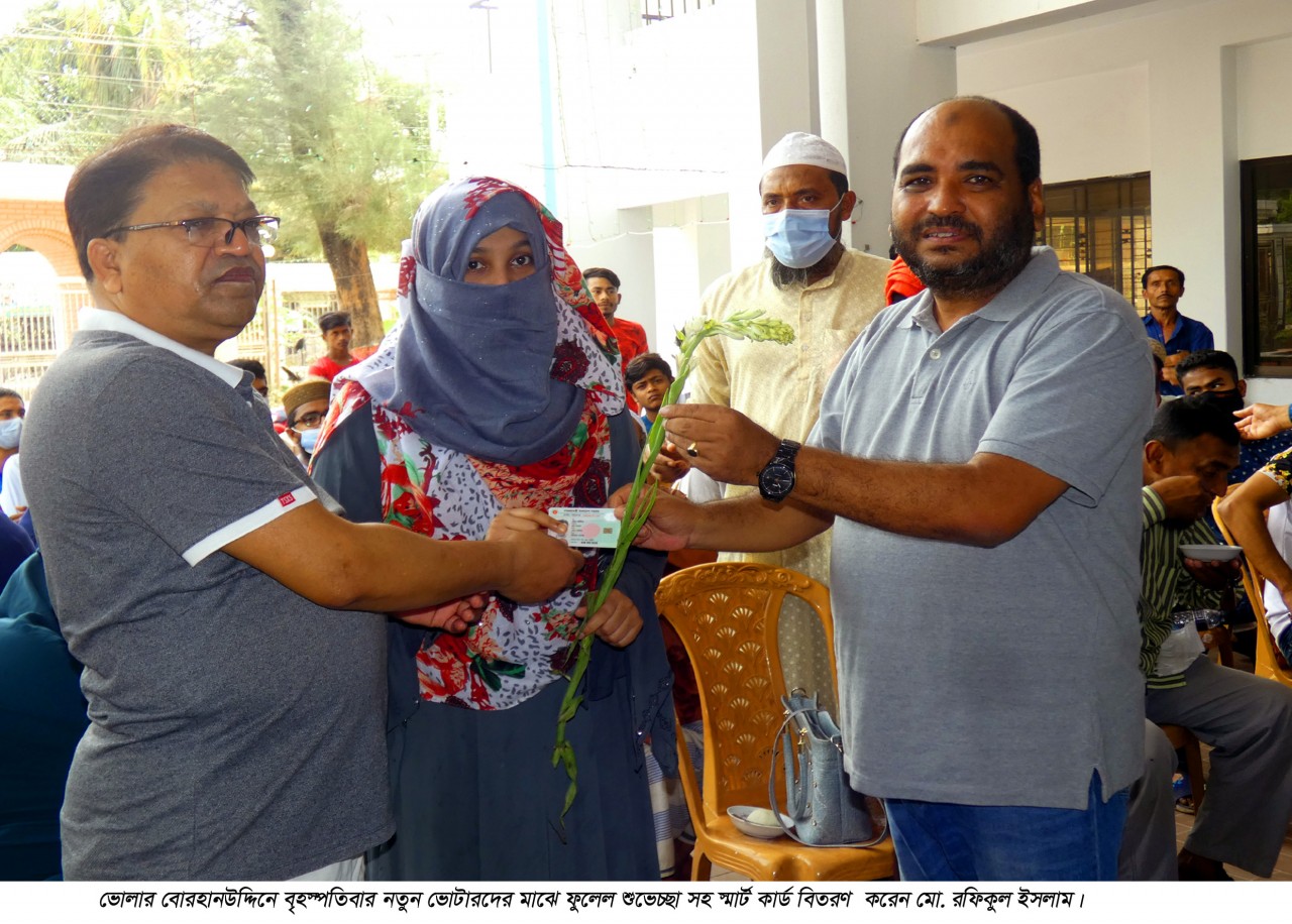 বোরহানউদ্দিন প্রতিনিধি \ ভোলার বোরহানউদ্দিনে ২০১৯ সালের পর যারা নতুন ভোটার হয়েছেন তাঁদের গোলাপ ও রজণীগন্ধা ফুল দিয়ে শুভেচ্ছা জানিয়ে স্মার্ট কার্ড বিতরণ করেছেন পৌর মেয়র মো. রফিকুল ইসলাম। বৃহস্পতিবার সকালে বোরহানউদ্দিন পৌরসভা প্রাঙ্গণে স্মার্ট কার্ড বিতরণ অনুষ্ঠানে প্রধান অতিথি হিসেবে উপস্থিত থেকে তিনি ১ হাজার ৫৩ জন তরুণ ভোটারদের মাঝে ওই কার্ড বিতরণ করেন।