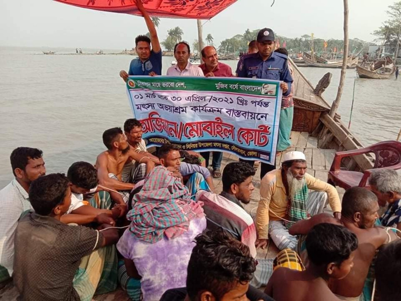 আজ বিকালে ভোলা সদর উপজেলার ধনিয়া, শিবপুর ও ইলিশার মেঘনা নদীতে অভিযান চালিয়ে ১৩ জেলেকে আটক করা হয়। এসময় মাছ ধরার কাজে ব্যবহৃত ২টি নৌকা, ২ হাজার মিটার কারেন্ট জাল, ২০ কেজি মাছ ও ২টি বেহুন্দিজাল জব্দ করা হয়। পরে নির্বাহী ম্যাজিষ্ট্রেট রায়হানুল ইসলামের ভ্রম্যমান আদালত আটক ১৩ জনকে ৫ হাজার টাকা করে জরিমানা করেন। জালগুলো আগুনে পুড়িয়ে ধংস করা হয়েছে। একই সময়ে দৌলতখানের মেঘনা থেকে ২১ জেলেকে আটক করে মৎস্য বিভাগের অভিযানকারী দল। এসময় তাদের কাছ থেকে ৫ হাজার মিটার জাল জব্দ করা হয়। আটককৃতদের ভ্রাম্যমান আদালতের মাধ্যমে বিচার করা হবে বলে জানিয়েছে মৎস্য বিভাগ।
