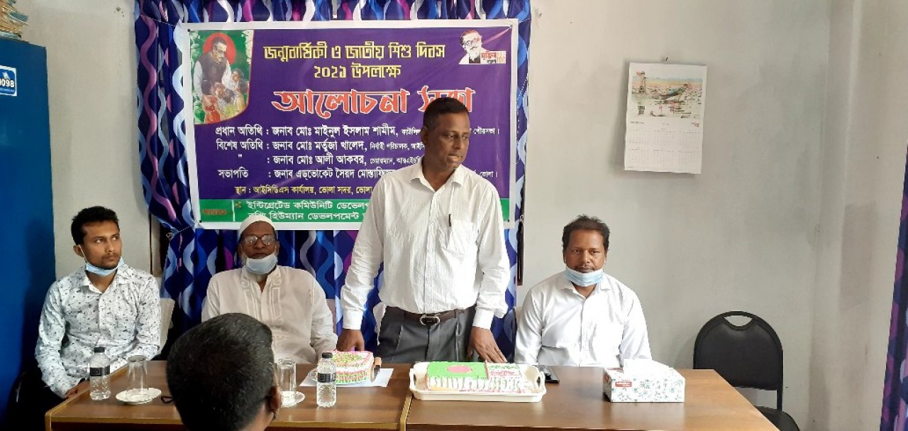 বাংলার কণ্ঠ প্রতিবেদক \ ভোলায় বিভিন্ন প্রতিষ্ঠান ও সংগঠনের পক্ষ থেকে বঙ্গবন্ধু শেখ মুজিবুর রহমানের ১০১তম জন্ম শতবার্ষিকী উদযাপন করা হয়েছে। বুধবার সকালে আইসিডিএস কার্যালয়ে এক আলোচনা সভা অনুষ্ঠিত হয়েছে। আলোচনা সভায় প্রধান অতিথি হিসেবে উপস্থিত ছিলেন ভোলা সদর উপজেলা সমাজসেবা কর্মকর্তা মো: দেলোয়ার হোসেন। আইসিডিএস এর চেয়ারম্যান সৈয়দ মাহবুবুর রহমানের সভাপতিত্বে আলোচনা সভায় আরো বক্তৃতা করেন, আইসিডিএস এর নির্বাহী পরিচালক মো: মর্তুজা খালেদ, আরএইচডিও এর নির্বাহী পরিচালক মো: সাইফুর রহমান, আইসিডিএস ব্রাঞ্চ ম্যানেজার সৈয়দ মুজিবুর রহমান ও সৈয়দ মোহাম্মদ মাহামুদুর রহমান, মুক্তধারা মহিলা সমিতির সভাপতি সৈয়দা মুমতাহিনা রাদিয়া প্রমূখ। আলোচনা সভায় এলাকার শতাধিক নারী-পুরুষ ও শিশু-কিশোর অংশগ্রহণ করেন। আলোচনা সভা শেষে বঙ্গবন্ধু শেখ মুজিবুর রহমানের জন্মদিন উপলক্ষে কেক কাটা হয়।