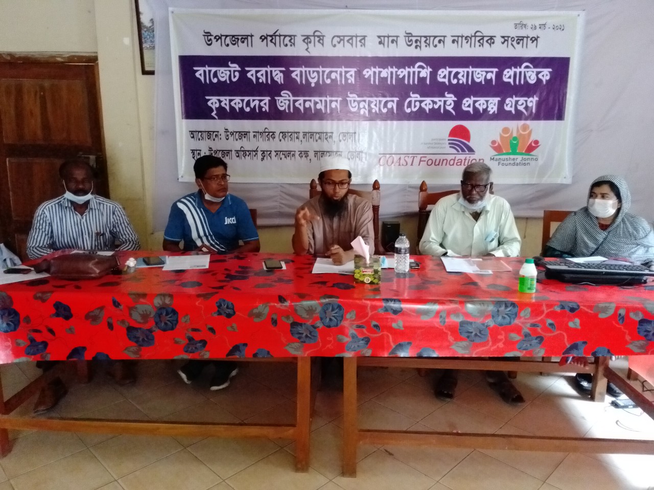 লালমোহন প্রতিনিধি: ভোলার লালমোহন উপজেলা নাগরিক ফোরামের উদ্যোগে ‘বাজেট বরাদ্ধ বাড়ানোর পাশাপাশি প্রয়োজন প্রান্তিক কৃষকদের জীবনমান উন্নয়নে টেকসই প্রকল্প গ্রহণ’ প্রতিপাদ্যকে সামনে রেখে নাগরিক সংলাপ অনুষ্ঠিত হ য়ছে। সোমবার সকালে কোস্ট ফাউন্ডেশন, সিইপিআই প্রকল্পের সহযোগিতায় লালমোহন অফিসার্স ক্লাব সম্মেলন কক্ষে এ সংলাপ হয়। এতে প্রধান অতিথি হিসেবে উপস্থিত ছিলেন, উপজেলা কৃষি কর্মকর্তা এ.এফ.এম শাহাবুদ্দিন।