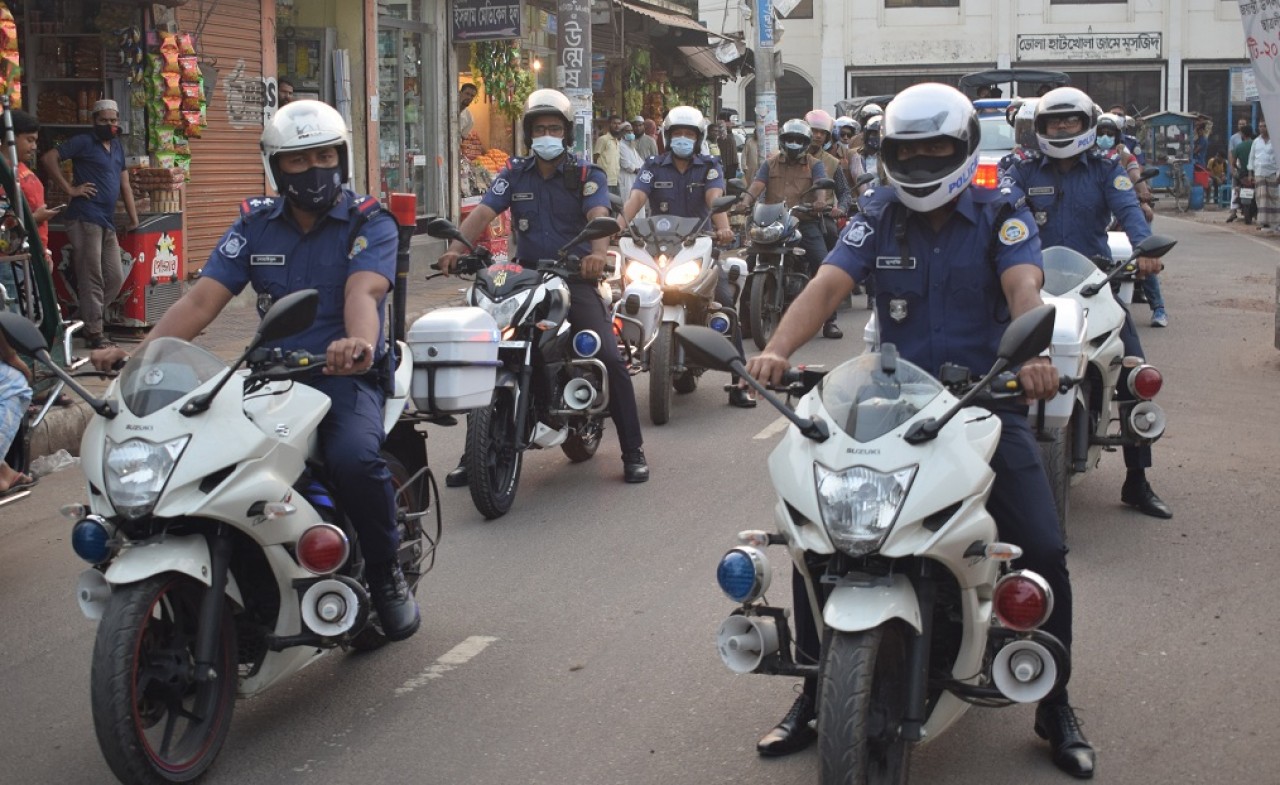 মহড়ায় অর্ধশতাধিক মোটারসাইকেল, পুলিশের পিকআপ ভ্যান এবং গাড়িতে কয়েকশ পুলিশ সদস্য অংশ গ্রহণ করে।