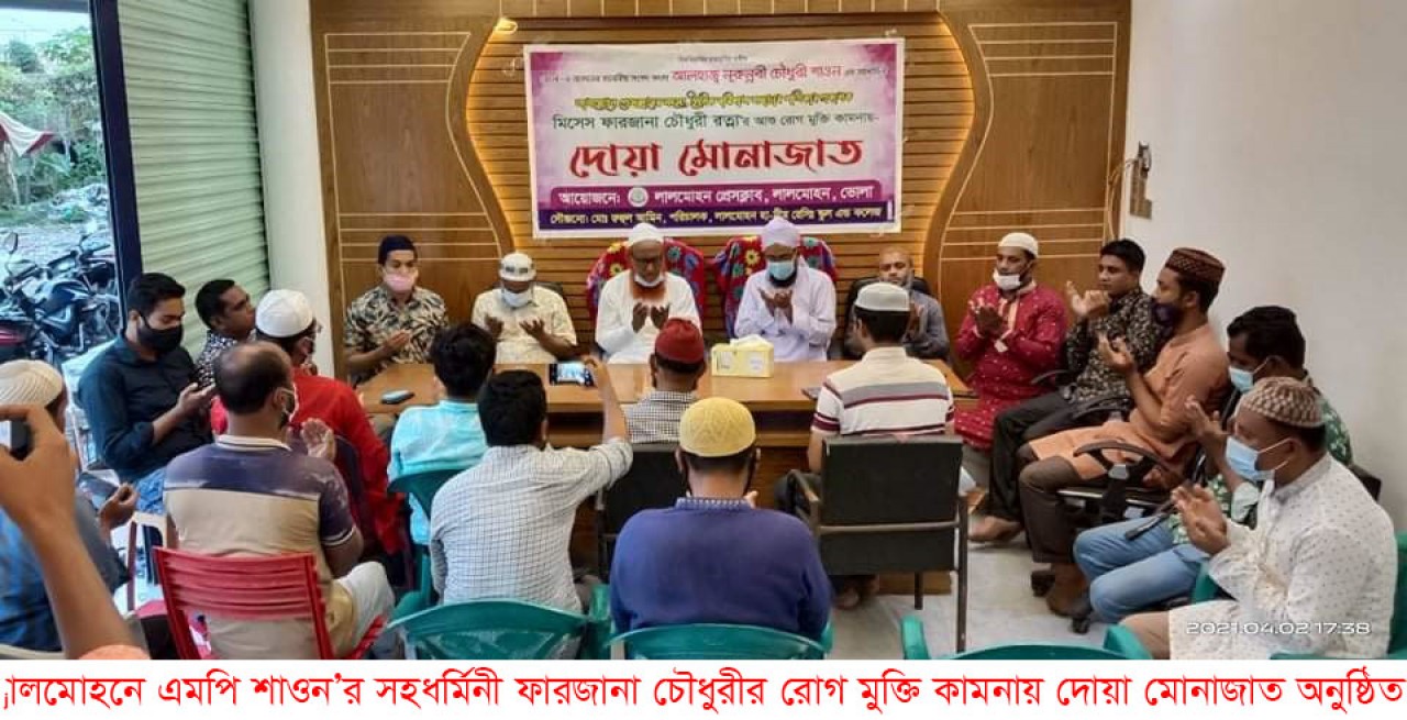 লালমোহন প্রতিনিধি : ভোলা-৩ (লালমোহন-তজুমদ্দিন) আসনের সংসদ সদস্য আলহাজ্ব নূরুন্নবী চৌধুরী শাওনের সহধর্মিনী, লালমোহন প্রেসক্লাবের সদস্য ও দৈনিক বরিশাল সমাচার পত্রিকার প্রকাশক মিসেস ফারজানা চৌধুরী রতœার আশু রোগ মুক্তি কামনায় দোয়া মোনাজাত অনুষ্ঠিত হয়েছে। ২ এপ্রিল শুক্রবার লালমোহন প্রেসক্লাবের আয়োজনে ও লালমোহন হা-মীম রেসিঃ স্কুল এন্ড কলেজের পরিচালক মোঃ রুহুল আমিন এর সৌজন্যে প্রেসক্লাবের অফিস কক্ষে আছর বাদ দোয়া মোনাজাত অনুষ্ঠিত হয়। লালমোহন প্রেসক্লাবের সহ-সভাপতি মাহমুদ হাসান লিটন এর সভাপতিত্বে দোয়া মোনাজাত পরিচালনা করেন লালমোহন মোল্লা জামে মসজিদের খতিব মাওলানা মোজাম্মেল। দোয়া মোনাজাতে অংশগ্রহণ করেন লালমোহন উপজেলা আওয়ামীলীগের সাধারন সম্পাদক ফকরুল আলম হাওলাদারসহ লালমোহন প্রেসক্লাবের সদস্যবৃন্দ।