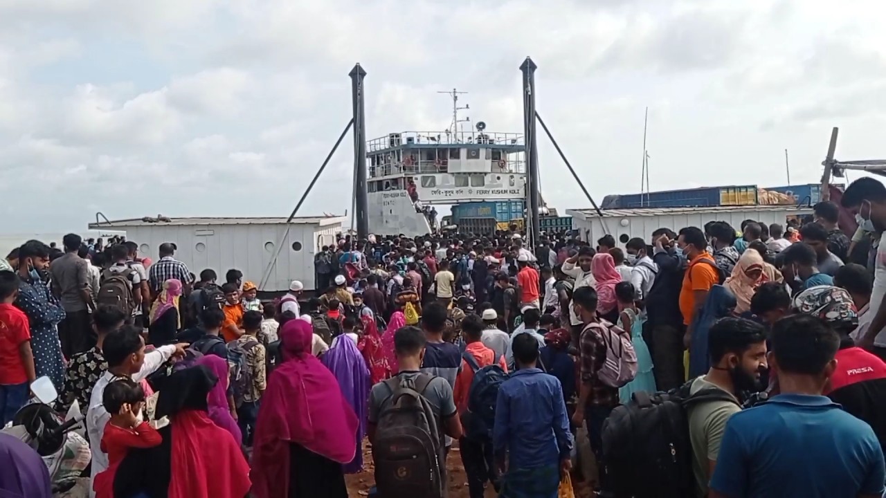 বাংলার কণ্ঠ প্রতিবেদক : ভোলার ইলিশা ফেরিঘাটে ঈদের ৪ দিন পরও মঙ্গলবার সকালে কর্মস্থলে ফেরা যাত্রীদের চাপ আরো বৃদ্ধি পেয়েছে। ঢাকা-চট্টগ্রাম ল²ীপুরসহ দেশের বিভিন্ন স্থানে যাওয়ার উদ্দেশ্যে আসা শতশত যাত্রী ঘাটে ফেরি আসতে বিলম্ব হওয়ায় ঘন্টার পর ঘন্টা অপেক্ষা করতে থাকে। কিন্তুু এসব যাত্রীদের মধ্যে স্বাস্থ্যবিধির কোনো বালাই ছিল না। সামাজিক দূরত্ব তো দূরের কথা,অনেক যাত্রীই মুখে ছিল না মাস্ক। এতে করে করোনা ভাইরাস সংক্রমণ ছড়িয়ে পড়ার আশঙ্কা দেখা দিয়েছে। একটি ফেরি আসা মাত্রই কে কার আগে উঠবে তার জন্য যাত্রীরা হুমরি খেয়ে পরে। যাত্রীদের সামাল দিতে গিয়ে নৌ পুলিশ ও কোস্টগার্ডকে হিমশিম খেতে দেখা যায়। ভোলা-ল²ীপুর রুটে মাত্র ৪ টি ফেরি চলাচল করলেও ছাড়ার নির্দিষ্ট কোন টাইম টেবিল না থাকায় যাত্রীদের দুর্ভোগ চরমে পৌঁছে।