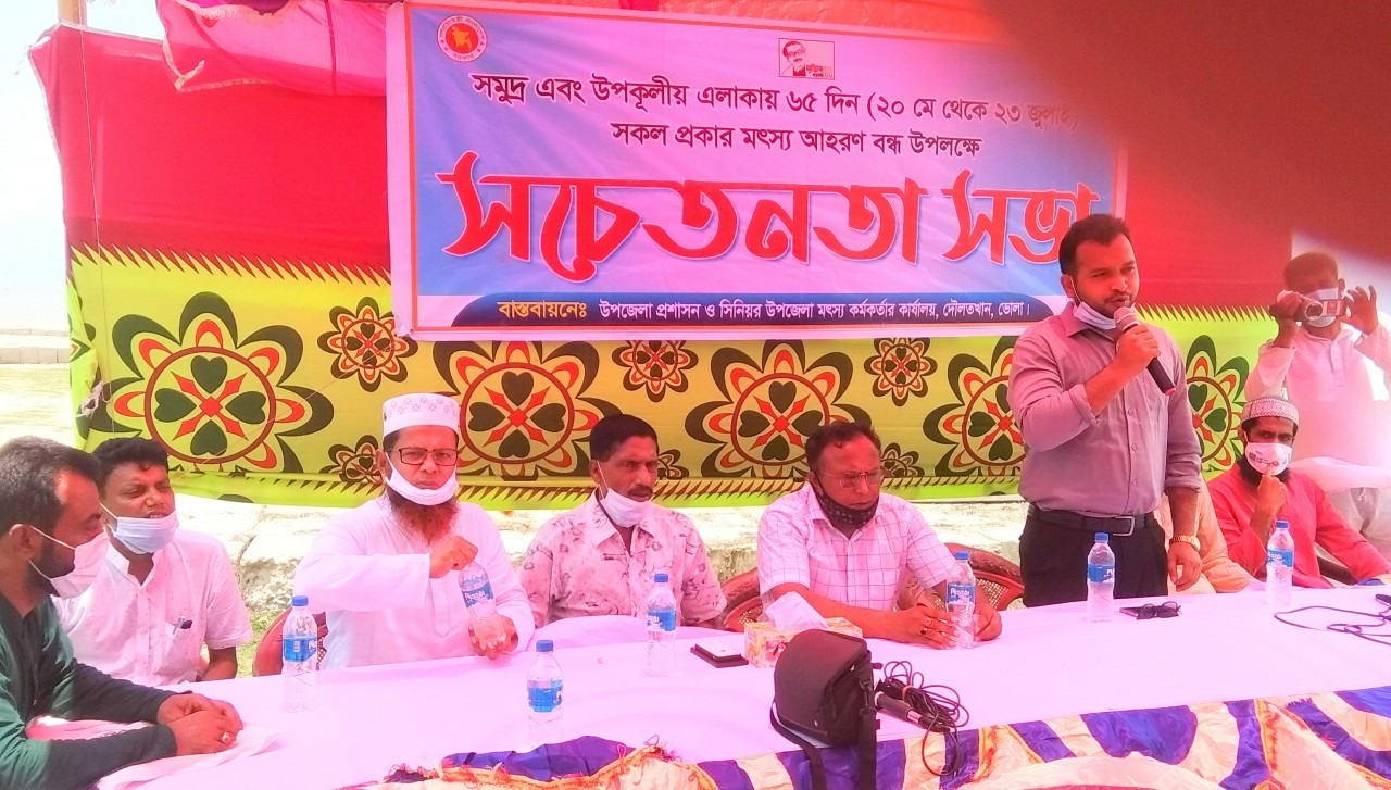 দৌলতখান প্রতিনিধি : দেশের সামুদ্রিক জলসীমায় আগামী (২০ মে থেকে ২৩ জুলাই পর্যন্ত) ৬৫ দিন সকল প্রকার মৎস্য আহরণ নিষিদ্ধ ঘোষণা করেছে সরকার। এ উপলক্ষে মঙ্গলবার ( ১৮ মে ) সকাল ১১টায় উপজেলা মৎস্য বিভাগের উদ্যোগে দৌলতখানের সৈয়দপুর ইউনিয়নের ঘোষেরহাট মাছ ঘাটে জেলেদের সাথে মৎস্য বিভাগের সচেতনতা সভা অনুষ্ঠিত হয়েছে। সচেতনতা সভায় বক্তারা বলেন,মাছ উৎপাদনে বিশ্বে বাংলাদেশের স্থান চতুর্থ, এটি নিঃসন্দেহে গৌরবের বিষয়। মাছ ধরার নিয়মকানুন সম্পর্কে মৎস্য আহরণকারীদের আরও সচেতন করা গেলে এর উৎপাদন আরও বাড়বে। জেলেরা বিভিন্ন ধরনের জাল ব্যবহার করে অনেকে নদী ও সমুদ্র থেকে মাছের ডিম পর্যন্ত তুলে আনছেন। এ ধরনের কাজ বন্ধ করার বিকল্প নেই। উপজেলা সিনিয়র মৎস্য কর্মকর্তা মাহফুজুল হাছনাইনের সভাপতিত্বে সভায় উপস্থিত ছিলেন,সৈয়দপুর ইউনিয়ন চেয়ারম্যান জি এস ভুট্টো তালুকদার, উপজেলা আওয়ামীলীগের যুগ্ম সাধারন সম্পাদক সাফিজল ইসলাম, উপজেলা আওয়ামীলীগের সাংগঠনিক সম্পাদক হামিদুর রহমান টিপু, সৈয়দপুর ইউনিয়ন আওয়ামীলীগ সভাপতি আব্দুল মালেক মাষ্টার, প্রাক্তন ইউপি সদস্য মেজবাহ উদ্দিন ঝট্টু, সাংবাদিক কাজি জামাল, রোমানুল ইসলাম সোহেব সহ প্রমুখ।
