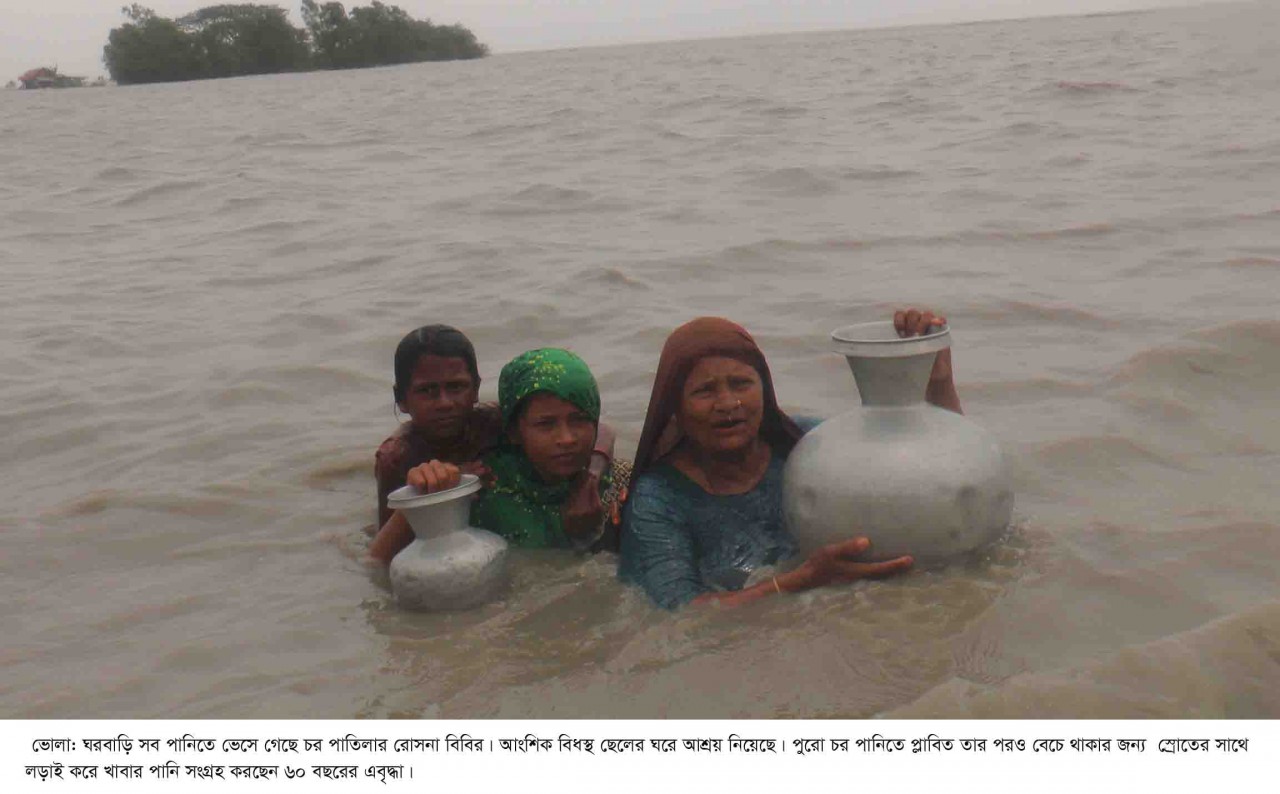 প্লাবিত এলাবার ক্ষয়-ক্ষতি পরির্দনে গিয়ে কলসভর্তি পানি নিয়ে ¯্রােতের সাথে বৃদ্ধার এমন লড়াই দৃস্টি কাড়ে গণমাধ্যম কর্মীদের। জানতে চাইলে রোসনা বিবি বলেন, গাঙের পানি মাথার ছাউনি, পেডের ভাত বেবাক কাইড়া নিছে। বাকী আছে জানডা (জীবনটা)। এইডা বাচানের লাইগ্যা এই যুদ্ধ। চারদিকে পানি থৈ থৈ করে। পারা দেওনের ( পা রাখার) মাডি (মাটি) পাইনা পানির লাইগ্যা কিন্তু হেই পানি মুাহে দিতে পারি না নুনের লাইগ্যা। পেডে গেলে কলেরা শুরু হয়। ভাত না খাইয়া ২/১দিন থাওন যায়। কিন্তু পানি না খাওয়া তো থাওন যায় না।