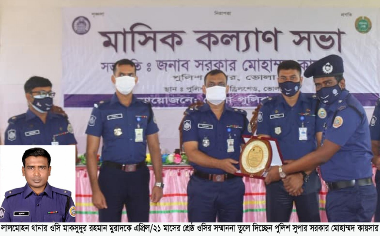 জানা গেছে, রোববার এপ্রিল/২০২১ ইং মাসের মাসিক কল্যাণ সভায় ভোলার পুলিশ সুপার সরকার মোহাম্মদ কায়সার লালমোহন থানার ওসি মাকসুদুর রহমান মুরাদকে ভোলা জেলার বেষ্ট অফিসার ইনচার্জ হিসেবে মনোনিত করেন। এসময় জেলার সকল উর্ধতন পুলিশ কর্মকর্তাগণ উপস্থিত ছিলেন।