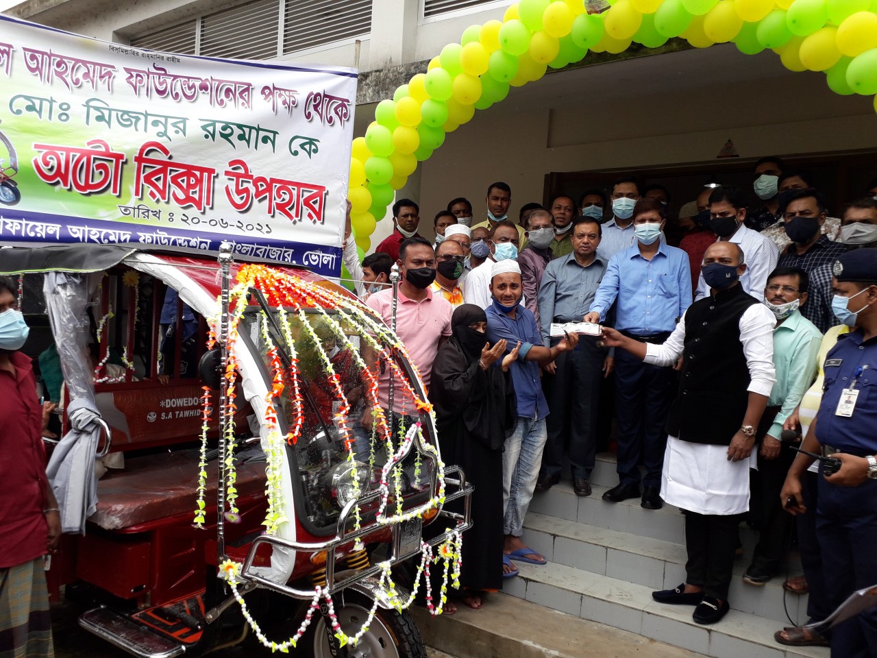 এদিকে শিশু বয়সে ধান মারাই শ্রমিকের কাজ করতে গিয়ে দুর্ঘটনায় হাতের কবজি বিচ্ছিন্ন হওয়া মোঃ মিজানুর রহমান ,তার মা বিবি ফাতেমা ও স্ত্রী রিনা বেগম ইজিবাইক পেয়ে শুকরিয়া আদায় করেন ও তোফায়েল আহমদের জন্য দোয়া করেন। মিজানের বাড়ি বোরহানউদ্দিন উপজেলার হাসাননগর ইউনিয়নের ৮ নং ওয়ার্ডে। গতমাসে এলাকার এক রোগী নিয়ে জেলা শহরের যুগিরঘোলের এ্যাপোলো ডায়গনোস্টিকে আসেন মিজান। পাশের ঈদগাহ মসজিদে নামাজ আদায় করতে গেলে চুরি হয়ে যায় তার আয়ের একমাত্র অবলম্বন ইজি বাইকটি। মা, স্ত্রী, সন্তান নিয়ে সংকটে পড়ে যান মিজান। ফেসবুকে এমন একটি বেদনাদায়ক ঘটনা তোফায়েল আহমেদের নজরে আসে। কর্মহীন ওই প্রতিবন্ধীর সহায়তায় নতুন ইজিবাইক উপহার দেন তিনি। তার নামের ফাউন্ডেশনটি ২০১৬ সালে প্রতিষ্ঠার পর থেকেই জনহিতকর কাজ করে যাচ্ছে। এর প্রতিষ্ঠাকালীন চেয়ারম্যান হচ্ছে তোফায়েল আহমেদ নিজেই। মহাসচিবের দায়িত্ব পালন করছেন, জেলা আওয়ামী লীগের সাংগঠনিক সম্পাদক মইনুল হোসেন বিপ্লব।