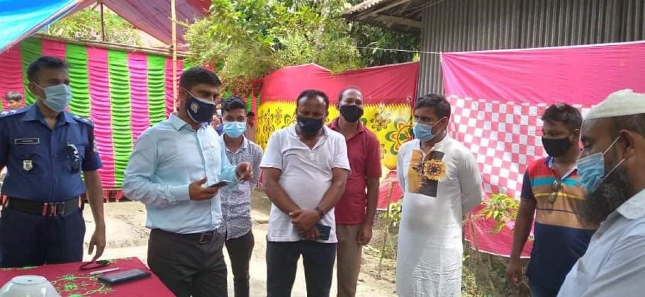 দৌলতখান প্রতিনিধি : করোনা ভাইরাসের সংক্রমণ প্রতিরোধে সরকারি বিধি নিষেধ দেয়া হলেও তা উপেক্ষা করায় ভোলার দৌলতখানে দুইটি বিয়ে বাড়িতে জরিমানা করা হয়েছে। রবিবার পৃথকভাবে ভ্রাম্যমান আদালত পরিচালনা করে উপজেলা নির্বাহী কর্মকর্তা ও নির্বাহী ম্যাজিস্ট্রেট মোহাম্মদ তারেক হাওলাদার এ জরিমানা করেন। এ বিষয়ে উপজেলা নির্বাহী কর্মকর্তা মোহাম্মদ তারেক হাওলাদার বলেন, দেশব্যাপী করোনা ভাইরাসের সংক্রমণ প্রতিরোধে সরকারিভাবে সকল ধরণের সভা সমাবেশ ও জন সমাগম নিষিদ্ধ করা হয়েছে। সরকারি নির্দেশনা অমান্য করে পৌরসভার ৬ নং ওয়ার্ডে জসিম উদ্দিন ও উপজেলার সৈয়দপুর ইউনিয়নের ৬ নং ওয়ার্ডের জাকির ভূইয়া বৌভাত অনুষ্ঠানের আয়োজন করেন। পরে ভ্রাম্যমাণ আদালত পরিচালনা করে জাকির ভূইয়াকে ১০ হাজার ও জসিম উদ্দিনকে ৫ হাজার টাকা জরিমানা করা হয়। এ সময় করোনা সংক্রমণ প্রতিরোধে সরকারি নির্দেশনা মেনে চলার অনুরোধ জানান তিনি। সেখানে সৈয়দপুর ইউপি চেয়ারম্যান জিএস ভুট্টু তালুকদার ও থানার উপ-পরিদর্শক (এসআই) কামাল সংগীয় ফোর্স সহ উপস্থিত ছিলেন।