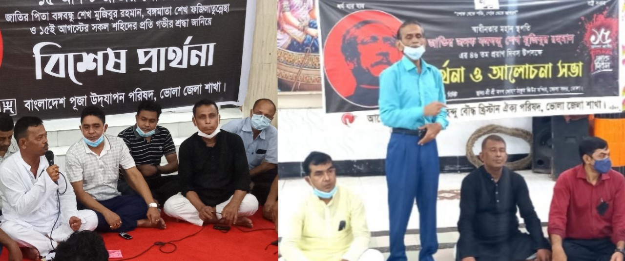 অচিন্ত্য মজুমদার :: জাতীয় শোক দিবস উপলক্ষে ভোলায় সনাতন ধর্মাবলম্বীদের বিভিন্ন সংগঠনের পক্ষ থেকে মন্দিরে মন্দিরে বিশেষ প্রার্থনা সভা অনুষ্ঠিত হয়েছে। রবিবার (১৫ আগস্ট) সন্ধ্যা সাড়ে ৭টায় শহরের শ্রী শ্রী লক্ষ্মী গোবিন্দ ঠাকুর জিউর মন্দির ও শ্রী শ্রী মদন মোহন ঠাকুর জিউর মন্দিরে পৃথক পৃথক প্রার্থনা সভার আয়োজন করে জেলা পূজা উদযাপন পরিষদ ও হিন্দু বৌদ্ধ খ্রিস্টান ঐক্য পরিষদ।