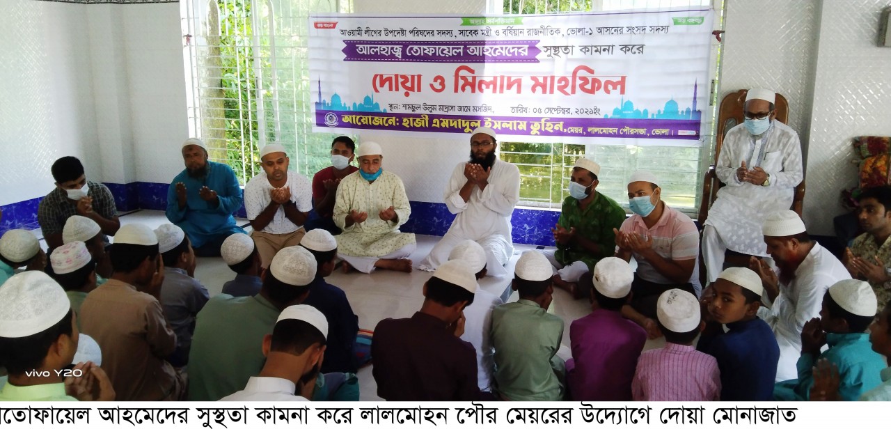 লালমোহন প্রতিনিধি : বাংলাদেশ আওয়ামী লীগের উপদেষ্টা পরিষদের সদস্য, সাবেক মন্ত্রী ও বর্ষিয়ান রাজনৈতিক, ভোলা-১ আসনের সংসদ সদস্য আলহাজ্ব তোয়ায়েল আহমেদের সুস্থতা কামনা করে ভোলার লালমোহনে দোয়া ও মিলাদ মাহফিল অনুষ্ঠিত হয়েছে। লালমোহন পৌরসভার মেয়র হাজী এমদাদুল ইসলাম তুহিনের উদ্যোগে রবিবার জোহরবাদ লালমোহন শামছুল উলুম কওমী মাদ্রাসা জামে মসজিদে দোয়া ও মিলাদ মাহফিল অনুষ্ঠিত হয়।