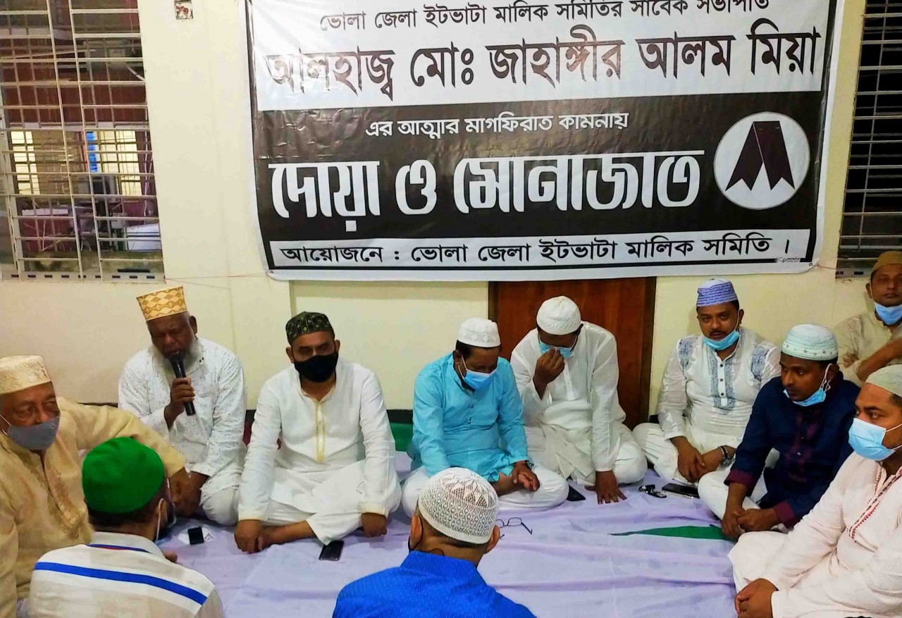 বাংলার কণ্ঠ প্রতিবেদক : দৈনিক বাংলার কন্ঠের উপদেষ্টা ও ভোলা জেলা ইটভাটা মালিক সমিতির সাবেক সভাপতি আলহাজ্ব জাহাঙ্গীর আলম মিয়ার ইন্তেকাল ও তাঁর আত্মার মাগফিরাত কামনায় দোয়া মাহফিল অনুষ্ঠিত হয়েছে । ৮ সেপ্টেম্বর মাগরিব বাদ ভোলা জেলা ইটভাটা মালিক সমিতির আয়োজনে সমিতির কার্যালয়ে এ দোয়া মাহফিল অনুষ্ঠিত হয় । এ সময় দোয়া মাহফিলে উপস্থিত ছিলেন ভোলা জেলা ইট ভাটা মালিক সমিতির সভাপতি মোশারেফ হোসেন দুলাল, সিনিয়র সহ সভাপতি মামুনুর রশীদ চৌধুরী ,জেলা ইট ভাটা মালিক সমিতির সাংগঠনিক সম্পাদক আলহাজ্ব তরিকুল ইসলাম কায়েদ, জেলা ইটভাটা মালিক সমিতির কোষাধ্যক্ষ খোকন গোলদার, দৌলতখান উপজেলা পরিষদের চেয়ারম্যান মন্জুর খান , ভোলা পৌরসভার ৫ নং ওয়ার্ডের কাউন্সিলর এরফানুর রহমান মিথুন মোল্লা, বাপ্তা ইউনিয়ন পরিষদের চেয়ারম্যান বিপ্লব মোল্লা, মরহুম জাহাঙ্গীর আলম মিয়ার পুত্র মোহাম্মদ জাবেদ, মো: জাহিদ সহ ইটভাটা মালিক সমিতির সদস্যবৃন্দ।