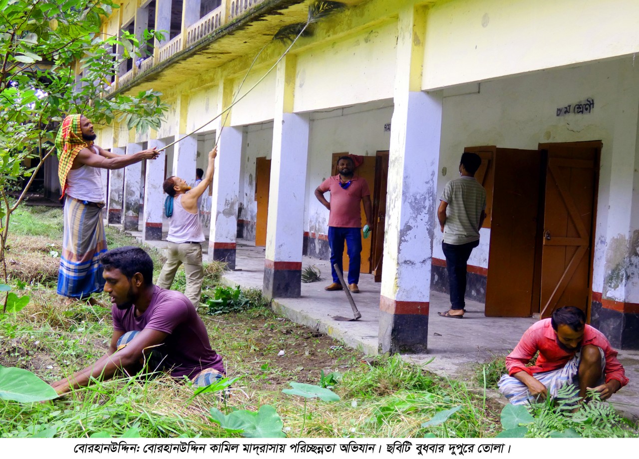 বুধবার সরেজমিনে সকালে উপজেলার বোরহানউদ্দিন কামিল(আলিয়া)মাদ্রাসায় দেখা যায় মাদ্রাসার ভিতর বাািহর সমানতালে পরিচ্ছন্নতার কাজ চলছে। শ্রেণিকক্ষের পাশাপাশি ওয়াশরুম, ঘাস, আবর্জনা পরিস্কার করা হচ্ছে। মাদ্রাসার অধ্যক্ষ এবি আহমদ উল্যাহ আনছারী জানান, ২-১ দিনের মধ্যেই সবধরনের পরিচ্ছন্নতা সম্পন্ন হবে।