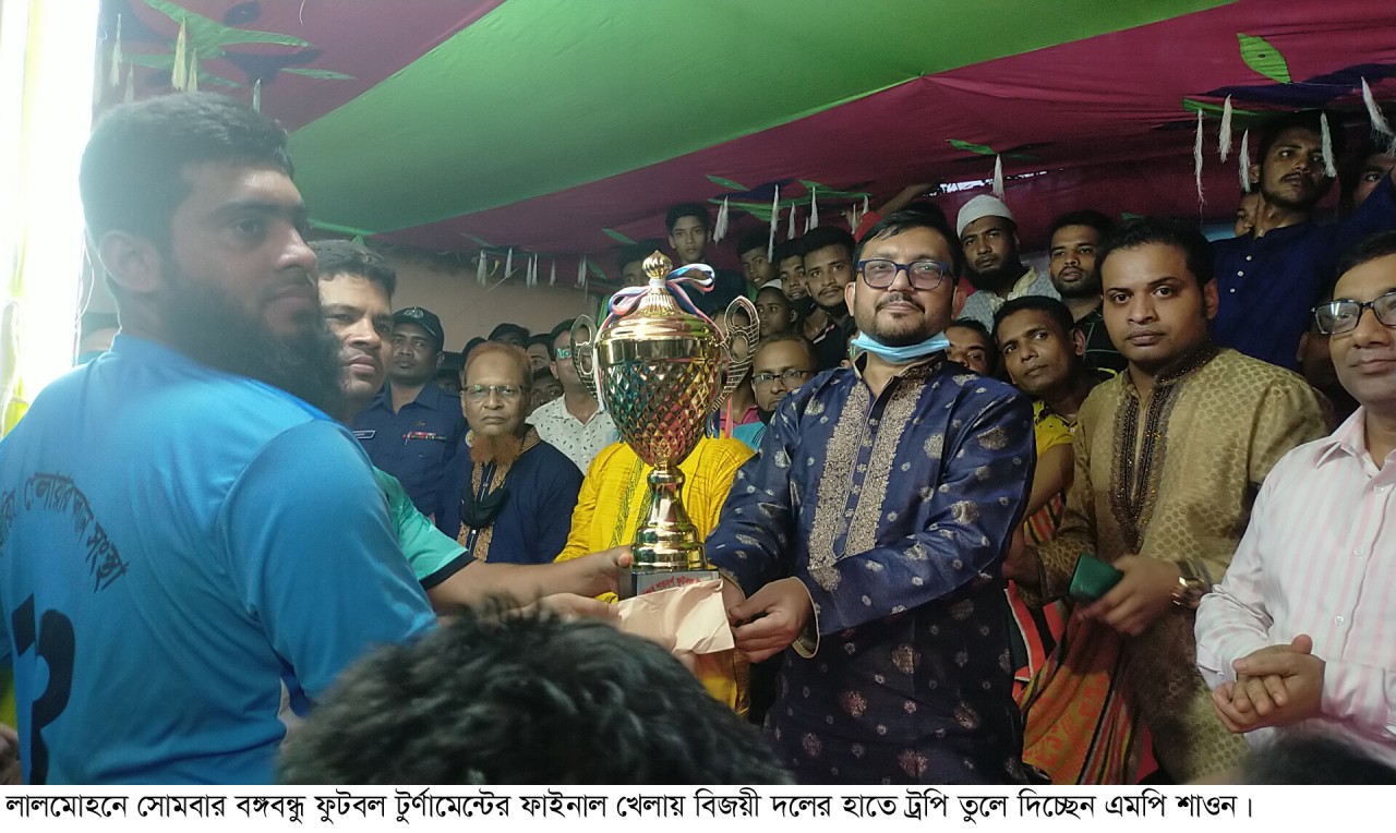 সোমবার বিকেলে মুজিব শতবর্ষের উপলক্ষে লালমোহন গজারিয়া খেলোয়াড় কল্যাণ সংস্থা আয়োজিত বঙ্গবন্ধু ফুটবল টুর্নামেন্ট এর ফাইনাল খেলা শেষে প্রধান অতিথি হিসেবে পুরস্কার বিতরণ করেন এমপি শাওন। এসময় বিশেষ অতিথি ছিলেন গৃহায়ণ ও গণপূর্ত মন্ত্রণালয়ের উপ-সচিব আবুল কালাম আজাদ, লালমোহন সার্কেলের অতিরিক্ত পুলিশ সুপার মো. রাসেলুর রহমান। সভাপতিত্ব করেন গজারিয়া খেলোয়াড় কল্যাণ সংস্থার সভাপতি সুমন বেপারী। ফাইনাল খেলায় ওসমানগঞ্জ ফুটবল একাদশকে ১ গোলে হারিয়ে চ্যাম্পিয়ন ট্রপি অর্জন করে গজারিয়া ফুটবল একাদশ।