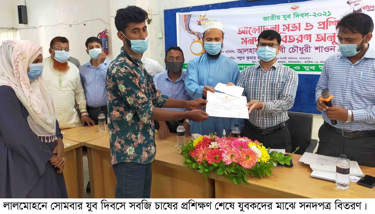 লালমোহন প্রতিনিধি : ভোলার লালমোহনে যুব নারী ও পুরুষদের স্বাভলম্বি করতে বসত বাড়িতে সবজি চাষ প্রশিক্ষণ শেষে সনদ বিতরণ ও জাতীয় যুব দিবস উপলক্ষে আলোচনা সভা অনুষ্ঠিত হয়েছে। সোমবার লালমোহন উপজেলা প্রশাসন ও উপজেলা যুব উন্নয়ন কার্যালয়ের আয়োজনে ৬০ জন যুবক নারী ও পুরুষের মাঝে এ সনদ বিতরণ অনুষ্ঠিত হয়। উপজেলা নির্বাহী অফিসার পল্লব কুমার হাজরা এতে সভাপতিত্ব করেন।