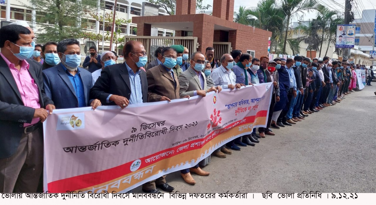 দৌলতখান প্রতিনিধি জানান, ভোলার দৌলতখানে আন্তর্জাতিক দুর্নীতিবিরোধী দিবস উদযাপন উপলক্ষে আলোচনা সভা ও মানববন্ধন করা হয়েছে। বৃহস্পতিবার সকালে উপজেলা পরিষদ সভাকক্ষে দুর্নীতি দমন কমিশনের ব্যানারে উপজেলা দুর্নীতি প্রতিরোধ কমিটি (দুপ্রক) এ কর্মসূচীর আয়োজন করে। ইউএনও মোহাম্মদ তারেক হাওলাদারের সভাপতিত্বে অনুষ্ঠানে উপস্থিত ছিলেন উপজেলা ভাইস চেয়ারম্যান মো: ছিদ্দিক মিয়া, মহিলা ভাইস চেয়ারম্যান আইনুন নাহার রেনু, মুক্তিযোদ্ধা সংসদের ডেপুটি কমান্ডার জগলুল পাশা, উপজেলা দুর্নীতি প্রতিরোধ কমিটির সভাপতি সাবেক অধ্যক্ষ শ.ম ফারুক, সম্পাদক অধ্যক্ষ জাবির হাসনাইন জাকির প্রমুখ। পরে উপজেলা পরিষদ চত্বরে দুর্নীতিবিরোধী মানববন্ধন করা হয়।