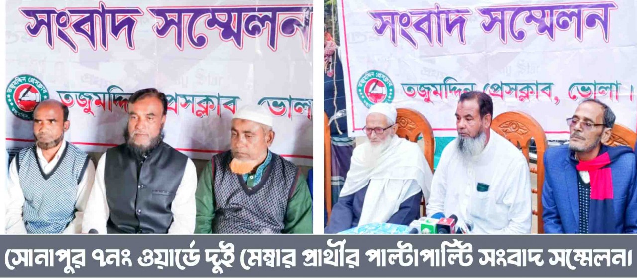 এম নয়ন ,তজুমদ্দিন : ভোলার তজুমদ্দিন উপজেলার সোনাপুর ইউনিয়নের ৭নং ওয়ার্ডের দুই মেম্বার প্রার্থী পাল্টাপাল্টি সাংবাদ সম্মেলন করে একে অন্যের বিরুদ্ধে অভিযোগ তুলেছেন। গত বুধবার দুপুর ১২টায় সোনাপুর ইউনিয়ন আওয়ামীলীগের সাধারণ সম্পাদক আঃ আজিজ ফারুক (ঘুড়ি প্রতিক) এবং বৃহস্পতিবার বিকেল ৪ টায় উপজেলা আওয়ামীলীগের নেতা সালেম মাতাব্বর (তালা প্রতিক) এ সংবাদ সম্মেলন করেন। সংবাদ সম্মেলন করার সময় উভয়ের সাথেই কর্মি সমর্থক উপস্থিত ছিলো। তারা উভয়ই সোনাপুর ইউনিয়ন পরিষদ নির্বাচনে ৭নং ওয়ার্ডে মেম্বার পদে প্রতিদন্ধিতা করছেন।