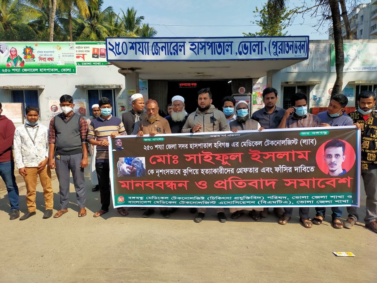 মানববন্ধন ও প্রতিবাদ কর্মসূচিতে বক্তারা বলেন, গত ২৮ শে ডিসেম্বর স্যাম্পল কালেকশন এর সময় বিলম্বিত হওয়ায় হবিগঞ্জ সদর হাসপাতালে মেডিকেল টেকনোলজিস্ট (ল্যাব) মোঃ সাইফুল ইসলামকে নৃশংসভাবে কুপিয়ে হত্যা করে দুর্বৃত্তরা। এ হত্যাকারীদের গ্রেফতার ও ফাঁসির দাবীতে বাংলাদেশ মেডিকেল টেকনোলজিস্ট অ্যাসোসিয়েশন ও বঙ্গবন্ধু মেডিকেল টেকনোলজিস্ট পরিষদ এর পক্ষ থেকে সারাদেশে মানববন্ধন ও অবস্থান ধর্মঘটের কর্মসূচি পালন করা হচ্ছে। এরই ধারাবাহিকতায় বাংলাদেশ মেডিকেল টেকনোলজিস্ট অ্যাসোসিয়েশন ও বঙ্গবন্ধু মেডিকেল টেকনোলজিস্ট পরিষদ ভোলা জেলা শাখার উদ্যোগে আজকের এ মানববন্ধন ও অবস্থান ধর্মঘট পালন করা। আমরা সাইফুল ইসলামের হত্যাকারীদের দ্রুত গ্রেফতার ও সর্বোচ্চ শাস্তি ফাঁসি দাবি করছি। আগামী ৩০ ডিসেম্বরের মধ্যে যদি দৃশ্যমান কোনো পদক্ষেপ গ্রহণ করা না হয় তাহলে সারা বাংলাদেশের ন্যায় কর্মবিরতি পালন করবে বাংলাদেশ মেডিকেল টেকনোলজিস্ট অ্যাসোসিয়েশন ও বঙ্গবন্ধু মেডিকেল টেকনোলজিস্ট পরিষদ ভোলা জেলা শাখা।