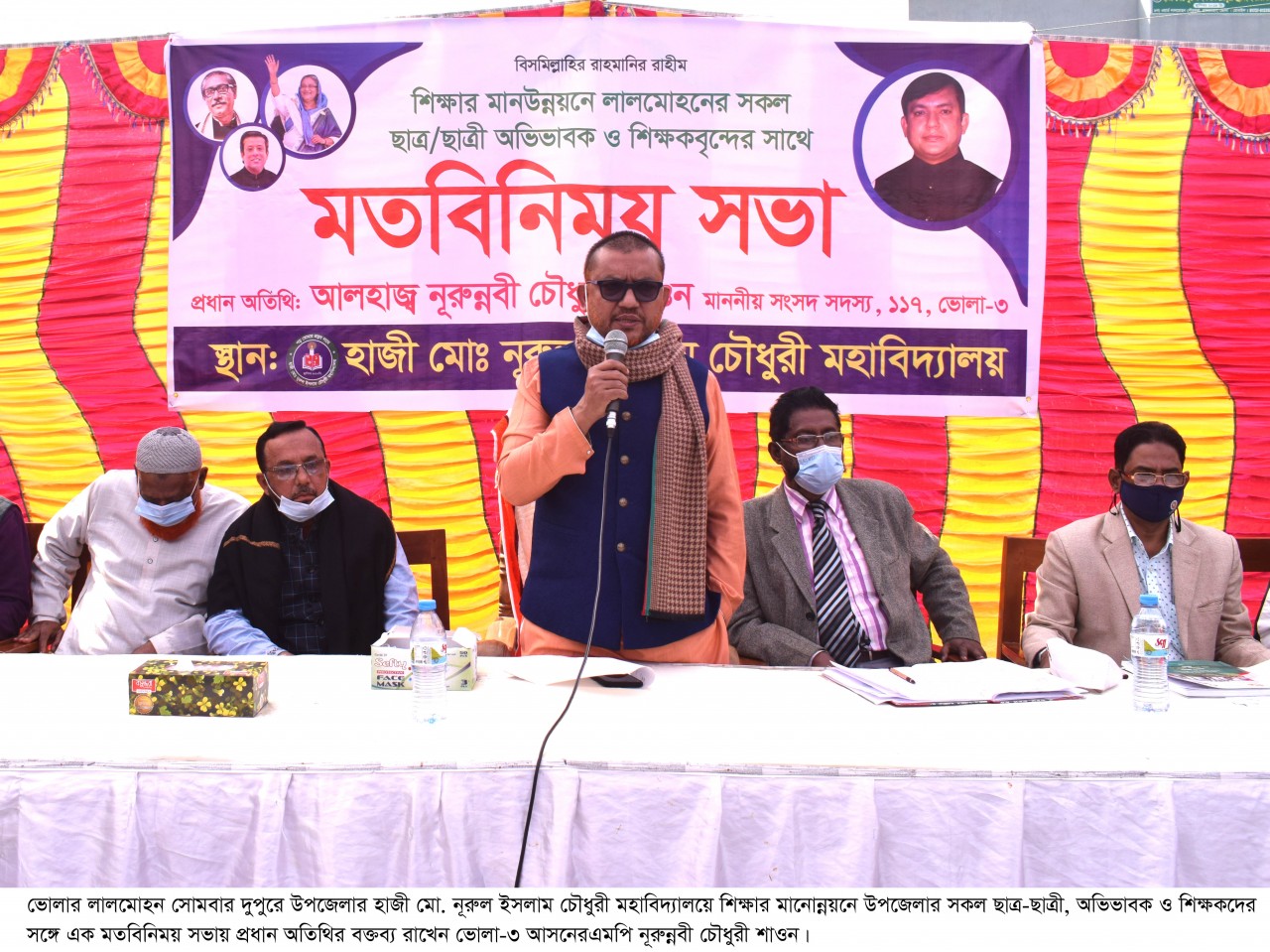 সোমবার দুপুরে ভোলার লালমোহন উপজেলার হাজী মো. নূরুল ইসলাম চৌধুরী মহাবিদ্যালয়ে শিক্ষার মানোন্নয়নে উপজেলার সকল ছাত্র-ছাত্রী, অভিভাবক ও শিক্ষকদের সঙ্গে এক মতবিনিময় সভায় এমপি নূরুন্নবী চৌধুরী শাওন এসব কথা বলেন। এরআগে উপজেলা পরিষদ হলরুমে মাসিক আইনশৃঙ্খলা কমিটির সভা, করোনা ভাইরাস প্রতিরোধ বিষয়ক সভা ও মুজিব বর্ষ উপলক্ষে আশ্রয়ণ প্রকল্পের গৃহীন নির্মাণ কমিটির সভায় প্রধান অতিথি হিসেবে অংশ গ্রহণ করেন তিনি।