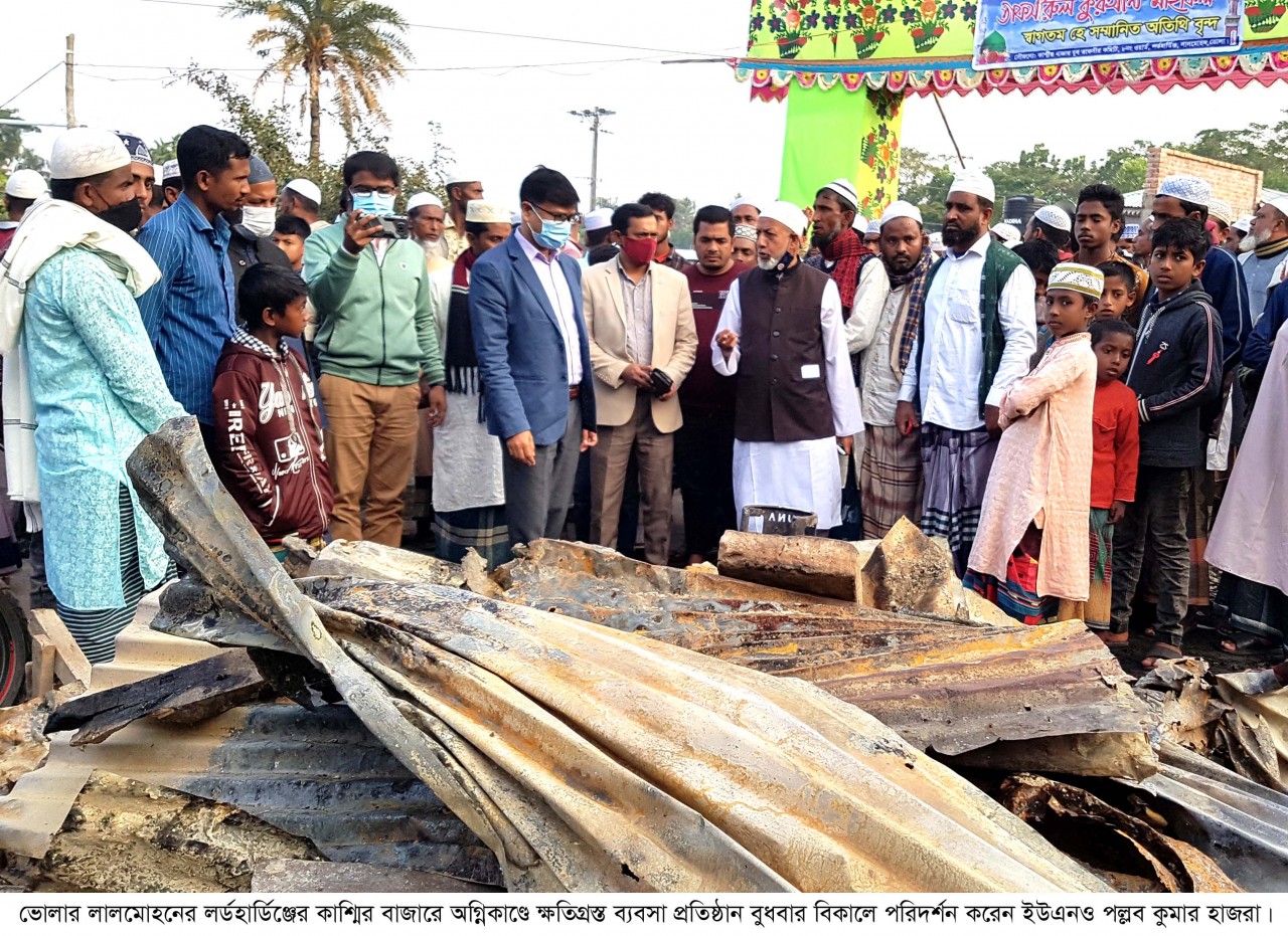 ভোলার লালমোহনের লর্ডহার্ডিঞ্জ ইউনিয়নের কাশ্মির বাজারে অগ্নিকান্ডের ঘটনা ঘটেছে। বুধবার ভোর রাতে বৈদ্যুতিক শর্ট সার্কিট থেকে লাগা আগুনে কিটনাশকের দোকানসহ ১০ টি ব্যবসা প্রতিষ্ঠান পুড়ে অন্তত ৩৫ লক্ষ টাকার ক্ষতি হয়েছে। এছাড়াও আগুনের লেলিহান শিখা দেখে স্ট্রোক করে মোসলেহ উদ্দিন মীরু সর্দার (৬৫) নামের এক বৃদ্ধের মৃত্যু হয়েছে। স্থানীয় লোকজন ও ফায়ার সার্ভিস কর্মীদের প্রায় ঘন্টাব্যাপী চেষ্টায় আগুন নিয়ন্ত্রনে আসে। অন্যদিকে বিকালে ক্ষতিগ্রস্ত বাজার পরিদর্শনে গিয়ে জেলা প্রশাসকের পক্ষে মৃত ব্যক্তির পরিবারকে ২৫ হাজার টাকা ও উপজেলা প্রশাসনের পক্ষ থেকে ক্ষতিগ্রস্ত ব্যবসায়ীদের ত্রাণ সামগ্রী ও কম্বল প্রদান করেন উপজেলা নির্বাহী কর্মকর্তা পল্লব কুমার হাজরা। এসময় প্রকল্প বাস্তবায়ন কর্মকর্তা সোহাগ ঘোষ, মেরিন ফিশারিজ কর্মকর্তা মো. তানভির আহমেদ, ইউপি চেয়ারম্যান আবুল কাশেম মিয়াসহ আরও অনেকে উপস্থিত ছিলেন।
